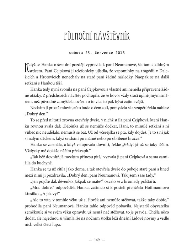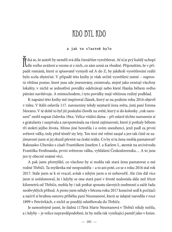 Marie Janíková-Neumanová, nejstarší žena světa, je sice fiktivní postavou, její osudy však vycházejí z reálných událostí, které se staly v první polovině 20. století na Třebíčsku. Kniha ale zaujme všechny čtenáře, kterým je blízký svět a příběhy našich babiček a dědečků. Příběhy, v nichž nechybí napětí ani láska.