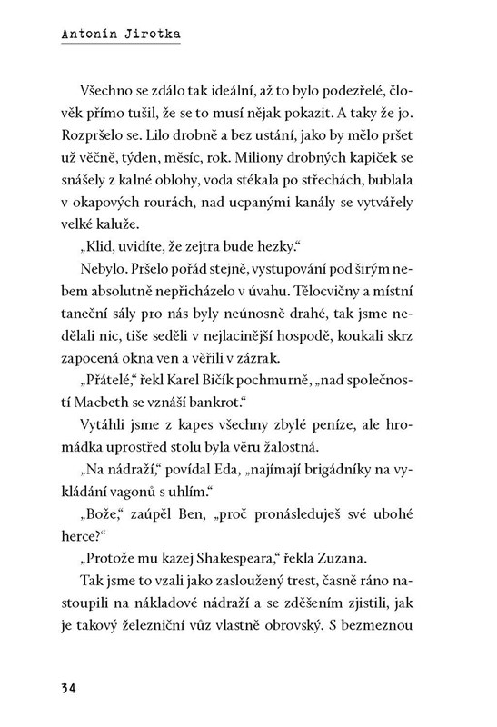 "Většina mých rozumných a cílevědomých spolužáků měla o posledních vysokoškolských prázdninách jasnou představu. Zcela ideální je sbírat zkušenosti někde v zahraničí, navazovat známosti, obchodní styky a jiné pitomosti. Já jsem všechny podobné příležitosti ignorantsky odmítal a představoval si, že nebudu plánovat vůbec nic. A pak mi do oka padl ten inzerát… Kočovná divadelní společnost Macbeth hledá řidiče."