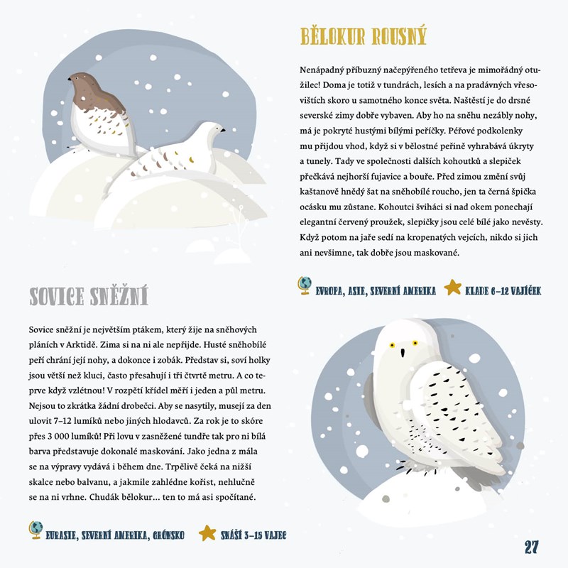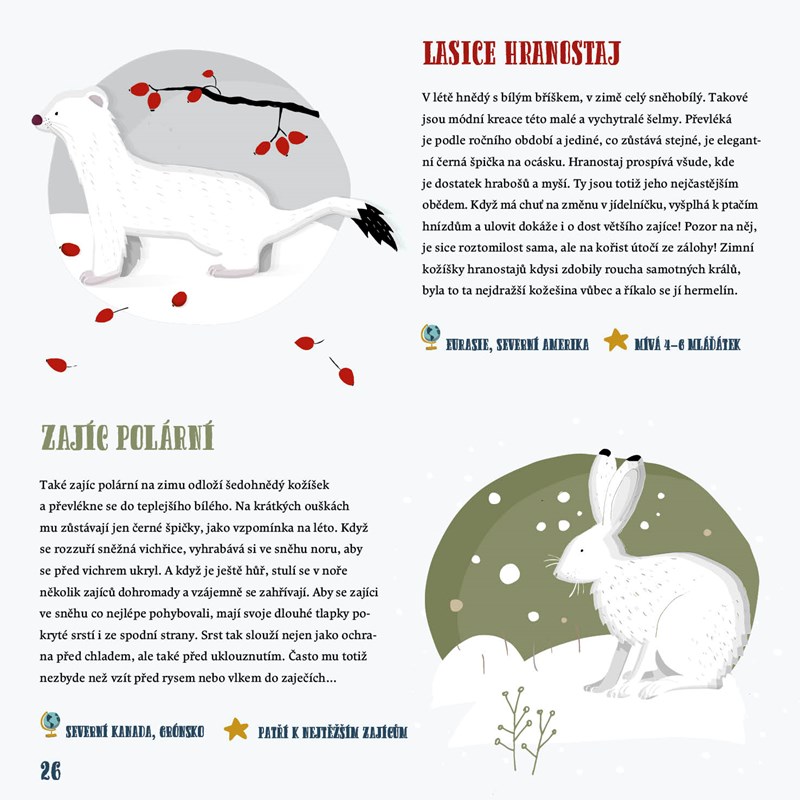 Na zimu se každé zvíře musí náležitě připravit. Takový medvěd se nejdříve pořádně vykrmí a pak si vyhlédne nejlepší brloh široko daleko, ten si vystele a zateplí a venku ať si klidně chumelí. A co teprve pelíšek mámy medvědice, které se uprostřed zimy narodí medvíďata, maličkatá a droboučká, že by se do dlaně vešla. Jestlipak tušíte, jak tráví zimu třeba krtek, tetřívek s červenou čapkou nebo sedmispáč plch? Že ne? Tak se pojďte rychle podívat! Ze stránek knihy budete mít pocit, že jste se ocitli v zasněženém království pod sněhovou peřinou. Součástí jsou tři velkoformátové mapy, z nichž se dozvíte, v jakých částech světa se toulají zimní dobrodruzi a chrupkají zimní spáči. Poslední zobrazuje stopy divokých zvířat v reálných velikostech.