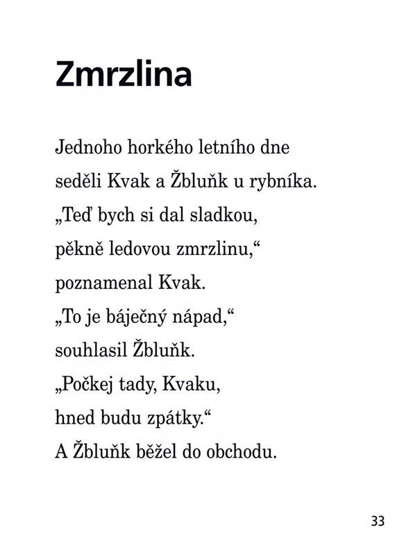 Zelený žabák Kvak a hnědý ropušák Žbluňk jsou velcí kamarádi a jeden bez druhého neudělá krok. Ale ani jejich přátelství není bez mráčku. Někdy je Kvak až příliš podnikavý a vymýšlí si výlety, které pohodlného Žbluňka stojí značné přemáhání. Přesto se mráčky brzy rozplynou a oba se společně pouští do nových dobrodružství. Přečtěte si, co všechno se nerozlučným kamarádům, které už možná znáte ze dvou předchozích knížek, přihodilo od jara do Vánoc. S Kvakem a Žbluňkem jde první čtení úplně samo!