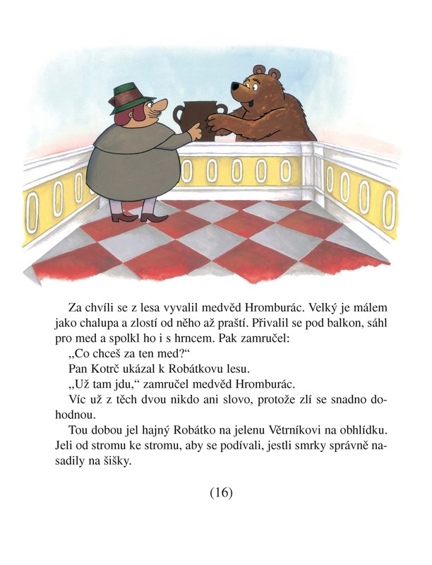 Hajný Robátko byl spravedlivý myslivec, o les i zvířata se dobře staral. A jelen Větrník mu věrně pomáhal. Komu se to však vůbec nelíbilo, byl pan Kotrč. A tak Robátkovi znepříjemňoval život, jak mohl – nejdřív na něj poslal medvěda Hromburáce, pak krtky, aby mu rozryli les, a jednou dokonce sám zasedl hajnému myslivnu. A co bylo dál? To už si přečtete v pěkné knížce plné lesa a zvířátek.