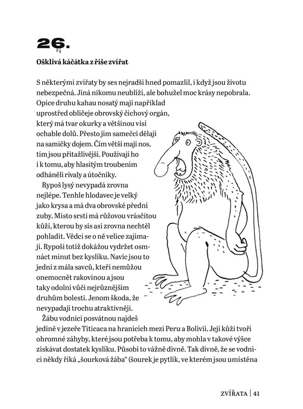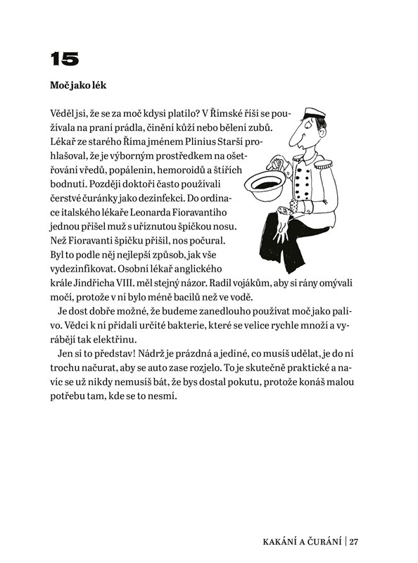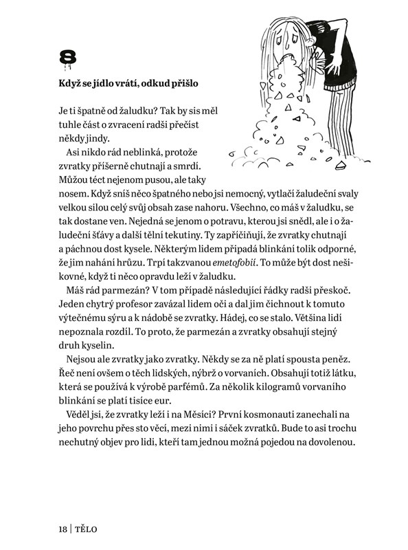 Tahle knížka ti nabízí 101 odporných (ale taky docela odborných) zajímavostí, bez kterých se v životě rozhodně neobejdeš. Jsou rozdělené do 10 různých kapitol a každá z nich se věnuje jiné oblasti: tělu, kakání a čurání, zvířatům, historii, světu kolem nás, rostlinám, divným (a hlavně nechutným) zvykům, vůním a chutím, jídlu a povoláním. Dostane se ti tedy opravdu širokého výběru těch největších nechuťáren, o kterých se vždy dozvíš něco nového, a tak se jimi budeš moct blýsknout třeba v hodinách přírodopisu nebo dějepisu. Vsaď se, že tvoje fyzikářka určitě neví, že v letadle se kvůli tlaku vzduchu prdí mnohem víc než na zemi!