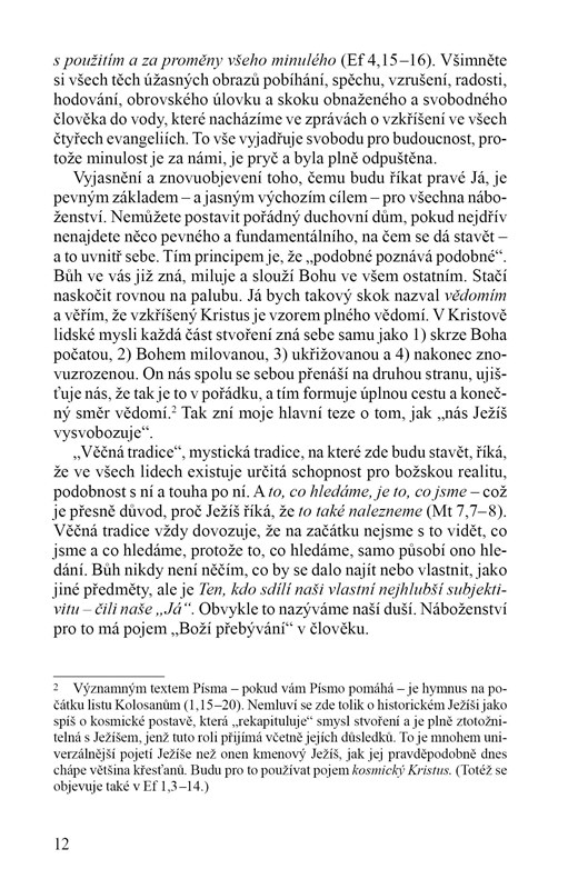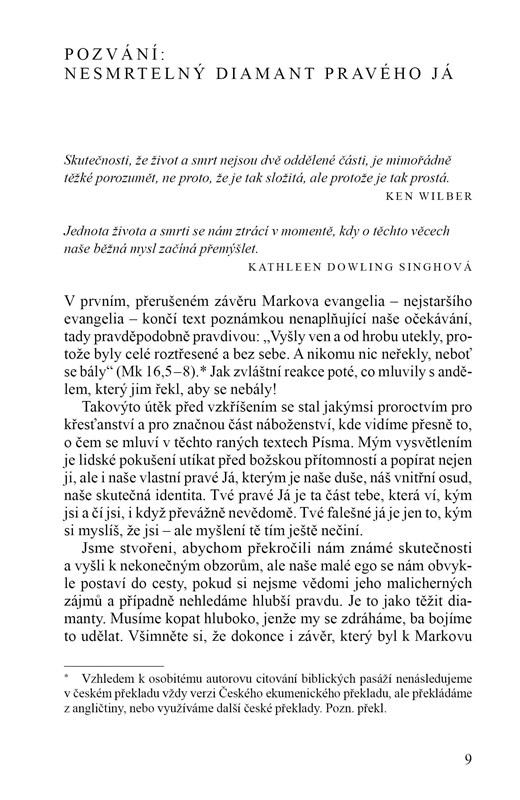 dotyční patří) místo přítomnosti nebo budoucnosti stvoření. … Chovám naději, že vám tato kniha především ujasní, a zvláště pak na základě vaší vlastní zkušenosti potvrdí, několik věcí, které platí pro všechny, ať jsou jakéhokoli vyznání, anebo i bez vyznání. Budu mluvit o Bohu, protože to je stále způsob, jakým mluví 95 procent světa a 99 procent dějin, ale myslím, že budete souhlasit, že to, co říkám o milosti, smrti a vzkříšení, je pravda pro každého a není třeba vůbec žádného vysloveně náboženského jazyk.“