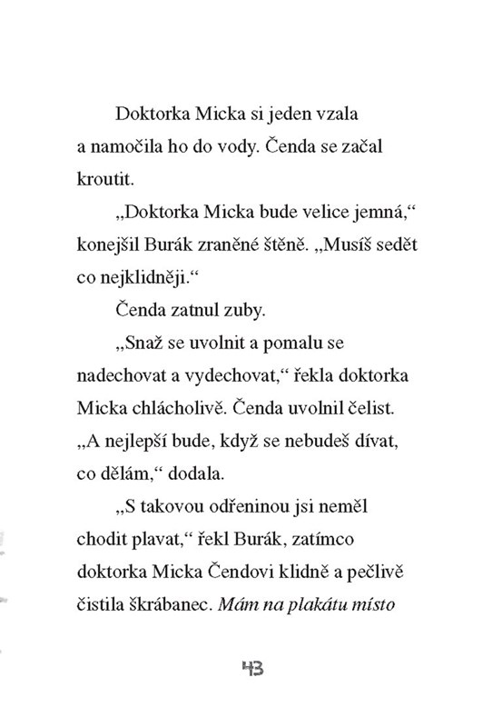 V Bodlákově slavnostně otevřeli nový bazén a doktorka Micka dostala za úkol vytvořit plakát s pravidly pro návštěvníky. Od práce ji vyruší volání o pomoc. Malé štěně mělo nehodu a poranilo si ocásek. Micka a Burák naštěstí ví co s tím!