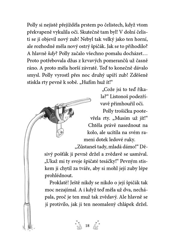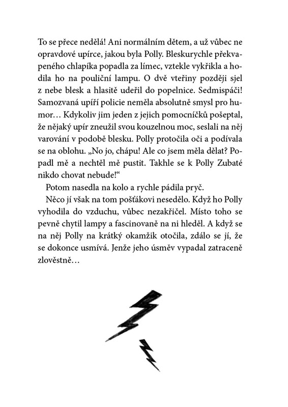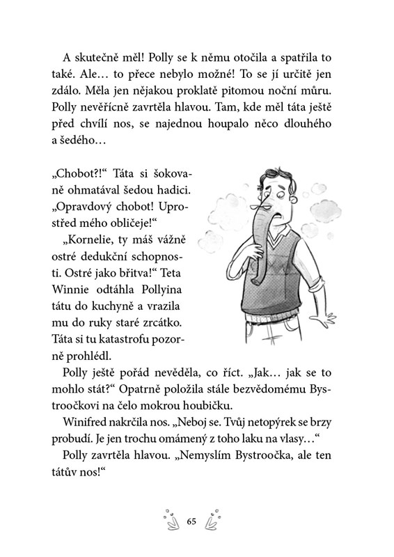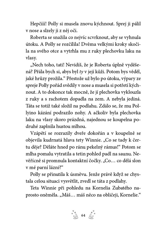 Zatraceně! Ten divný pocit hned po probuzení znamená jediné: Polly se vyklubal druhý špičák. A spolu s ním přibyla i další kouzelná schopnost, díky které se jí podařilo přeměnit tátu ve slona. A to není jediná pohroma. Velké lásce netopýra Bystoočka, slonici Robertě, hrozí, že ji pošlou pryč. Ještě že je tu Polly, její kamarád Pavel a hlavně hausbót tetičky Winnie. Kdo by přece hledal tlustokožce na lodi?