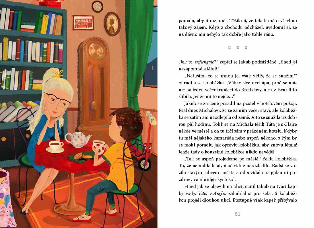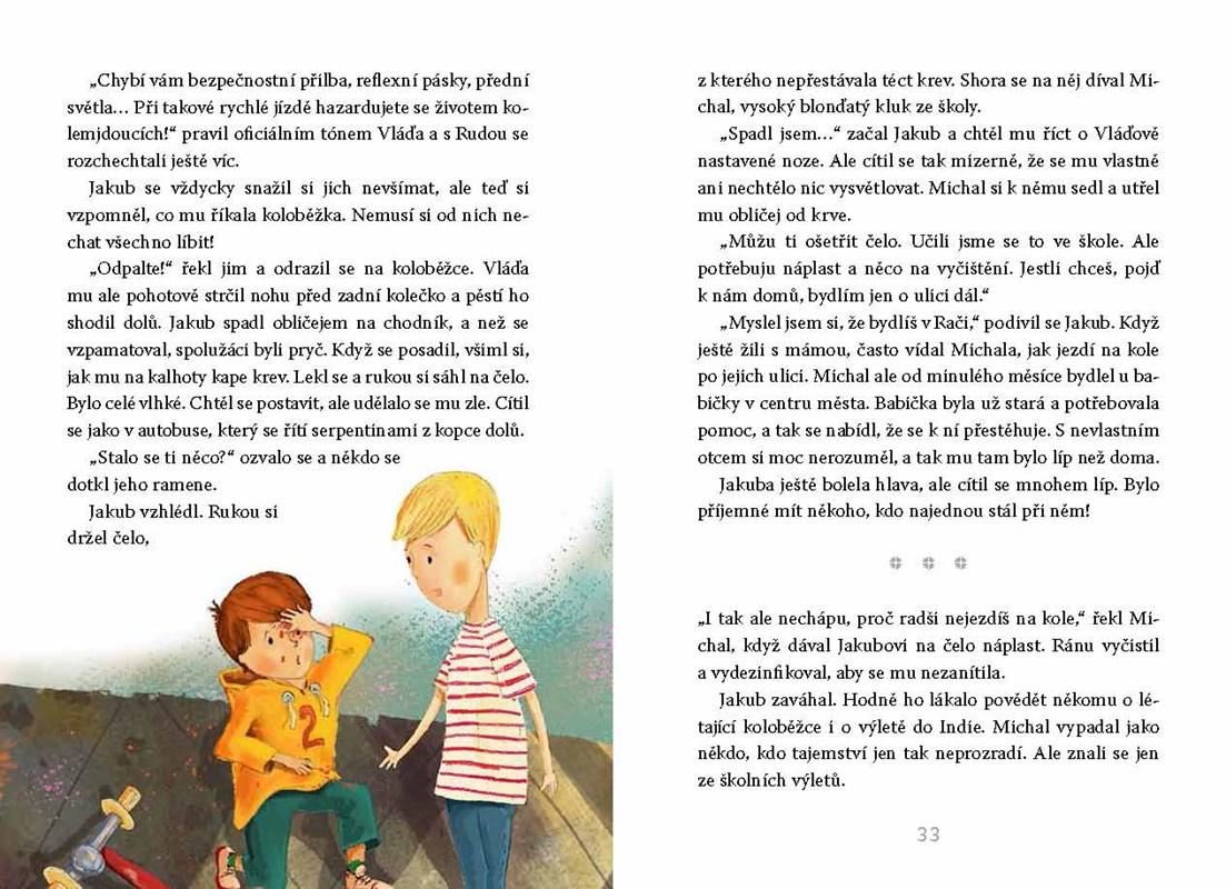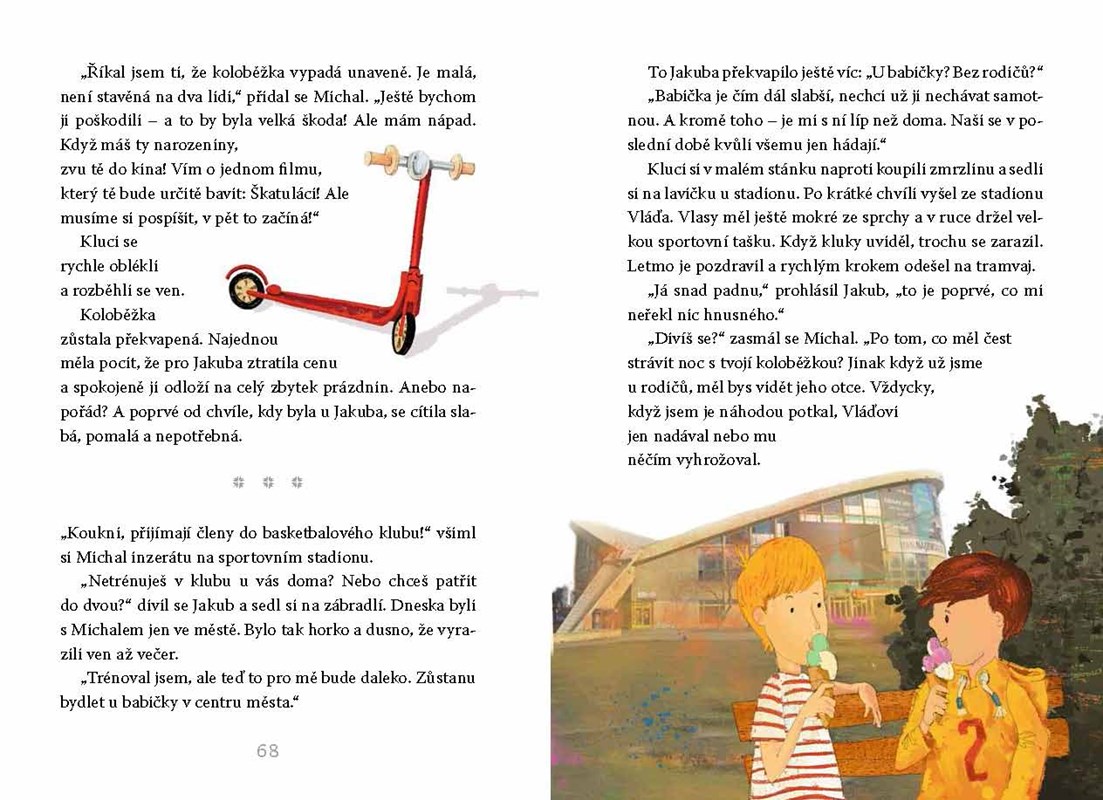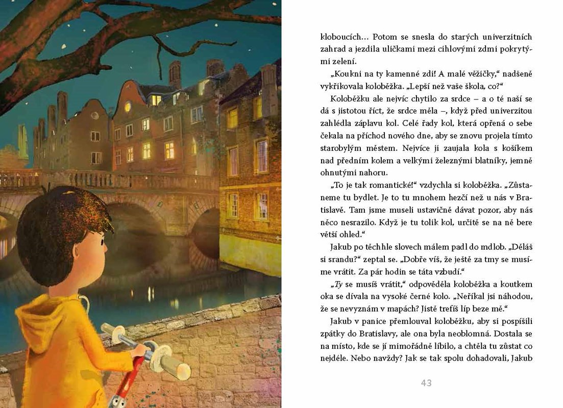 Jakub bývá často sám. Žije jen s tatínkem, nemá žádné sourozence, a i kamarády si hledá těžce. To všechno se ale změní, když jednoho dne najde starou opuštěnou červenou koloběžku. Vezme ji domů, opraví ji a světe div se! Koloběžka k němu promluví. A nejen to! Začnou se dít úžasné věci a Jakub zažije neuvěřitelná dobrodružství. Vždyť který kluk se může v noci tajně vykrást z domu, vydat se do Indie, Francie či Anglie a ráno opět s úsměvem snídat doma v kuchyni?