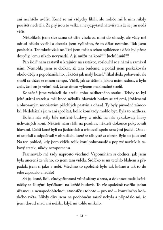 A tak děvčica z jihomoravské vísky zahájila svou spanilou jízdu za štěstím. I přes dobře míněné rady matky a babičky se z poslušné holky postupně stala nadšená chovatelka zvířat, ředitelka banky, majitelka svatební agentury, porodní bába jedenácti štěňat a matka dvou dětí. A také spisovatelka, jejíž optimistický, humorem nabitý příběh si teď můžete přečíst.