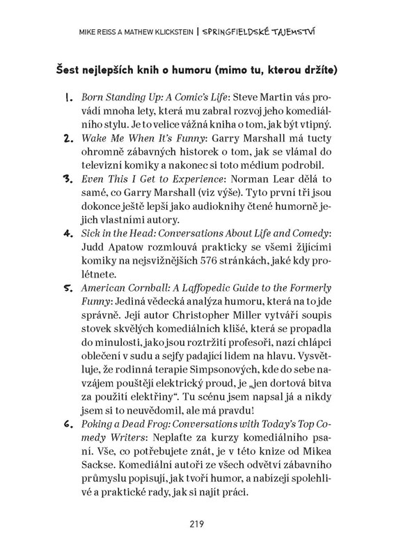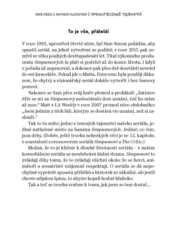 Profesionální vtipálek se zároveň zamýšlí nad vlastním životem se Simpsonovými a zdůrazňuje své úspěchy i neúspěchy. Čtenářům prozradí, proč jsou všechny postavičky v seriálu žluté, jaké to je trávit šedesát hodin týdně v místnosti plné humoristů nebo na co přišel při cestě po 70 zemích světa, kde Simpsonovy vysílají (v některých přitom ani nefunguje elektřina!).