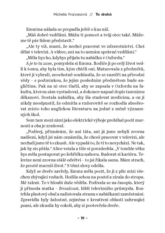 Na scénu vstupuje Emma jako Carriina náhradnice, která má všechno, co by si mohla přát: je mladá, chytrá, ochotná a okouzlující. Krůček po krůčku Emma hladce získává vše, na čem Carrie tak tvrdě dřela. A navíc Emmu všichni zbožňují…