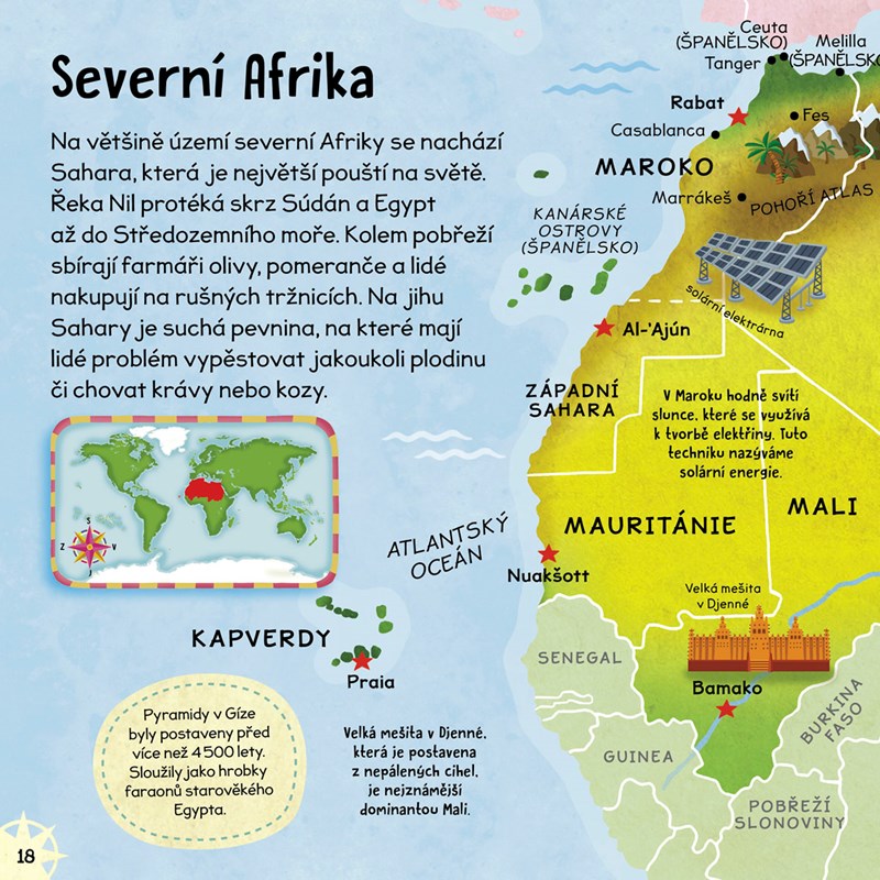S tímto bohatě ilustrovaným atlasem procestují celou zeměkouli a seznámí se se všemi světadíly. Prosředníctvím více než dvaceti názorných map zjistí spoustu zajímavostí, které si díky obrázkům snadno zapamatují. Nechybí velký plakát mapy světa, který si mohou nalepit na zeď!
