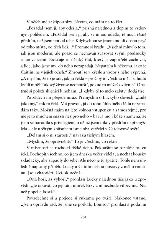 Lou se s majiteli brzy spřátelila a život společenské smetánky si začala užívat plnými doušky. Vzdala se svých vlastních ambicí a propadla lehkomyslnosti. Brzy však zjistila, že rodina Cardewových má tajemství a že pod třpytivým pozlátkem se ukrývá prázdno a temnota...