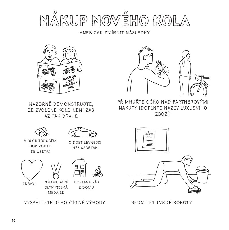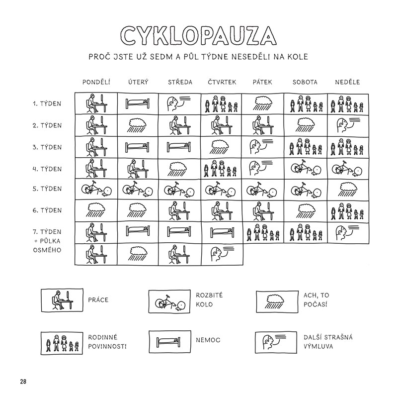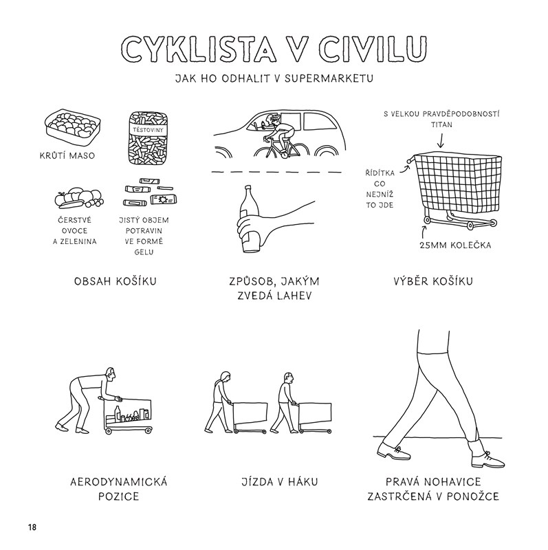 Díky této knížce se o své oblíbené outdoorové činnosti dozvíte ledacos nového a zároveň si připomenete, co k ní neodmyslitelně patří – například bláto na zádech či neúprosné hranice opálení po projížďce v dresu s krátkým rukávem a v elastických kraťasech ladně opisujících linie vašeho těla… Naleznete zde vychytávky pro rychlejší jízdu, tréninkové a nutriční rady, přehled taktických postupů, ať už pro jízdu v balíku, v úniku, ba dokonce v supermarketu! Nechybí ani periodická tabulka cyklistů. Vše podáno s nadhledem a jemným anglickým humorem.