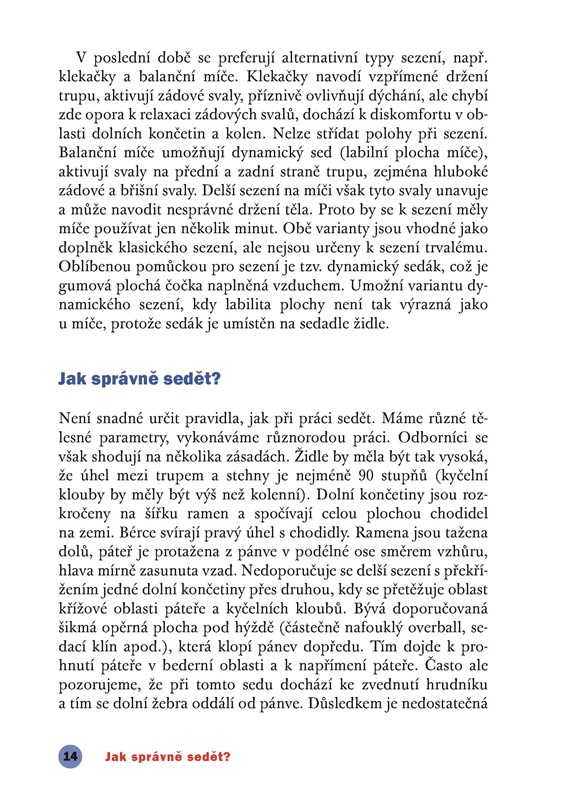 Žijeme v civilizovaném světě plném technických vymožeností, právě kvůli nim však máme nedostatek přirozeného pohybu. Práce vsedě znamená mnoho hodin strávených na kancelářské židli v jednostranné statické poloze. Často jsme unavení a trpíme bolestmi hlavy, zad a kloubů. Jaké obtíže pohybového aparátu způsobuje dlouhodobý sed? Co by měla splňovat kancelářská židle? Jak na židli správně sedět a jak z ní vstávat? Na to vše dává srozumitelné odpovědi nová kniha fyzioterapeutky Simony Sedlákové, která nabízí jednoduché a osvědčené řešení v podobě cvičení. Cviky jsou zaměřené na krční, hrudní, bederní páteř a na horní a dolní končetiny. Cvičit lze v kanceláři na židli, v autě i doma bez větších časových nároků a speciálních pomůcek. Jaké svaly naše tělo používá, aby udrželo stabilitu? Proč je bránice tak důležitá? Odpověď se dozvíme v závěrečné kapitole, kde jsou shrnuty nové poznatky ve fyzioterapii.