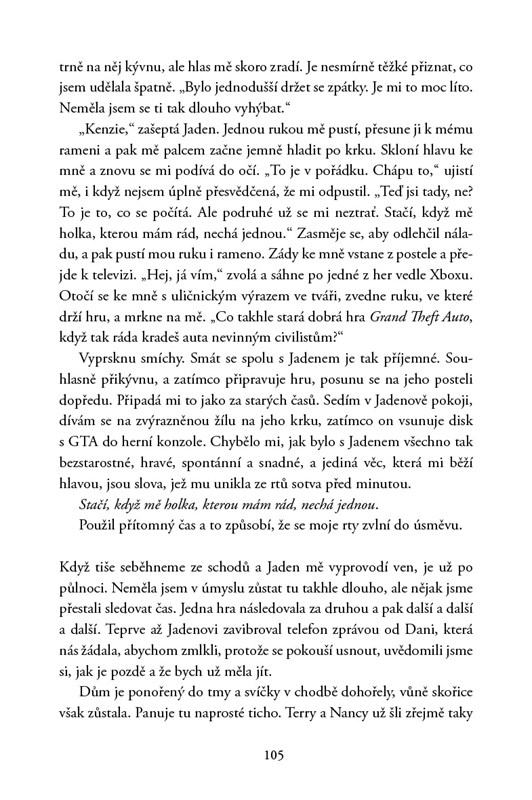 Po několika měsících ale na Jadena náhodou narazí. A dřív, než stihne znovu vystavět svou obrannou zeď, jsou zpátky staré vzpomínky a city. Málem spolu před nehodou začali chodit, a i když se to snažila vytěsnit, o to víc si nyní uvědomuje, jak moc jí chyběl.