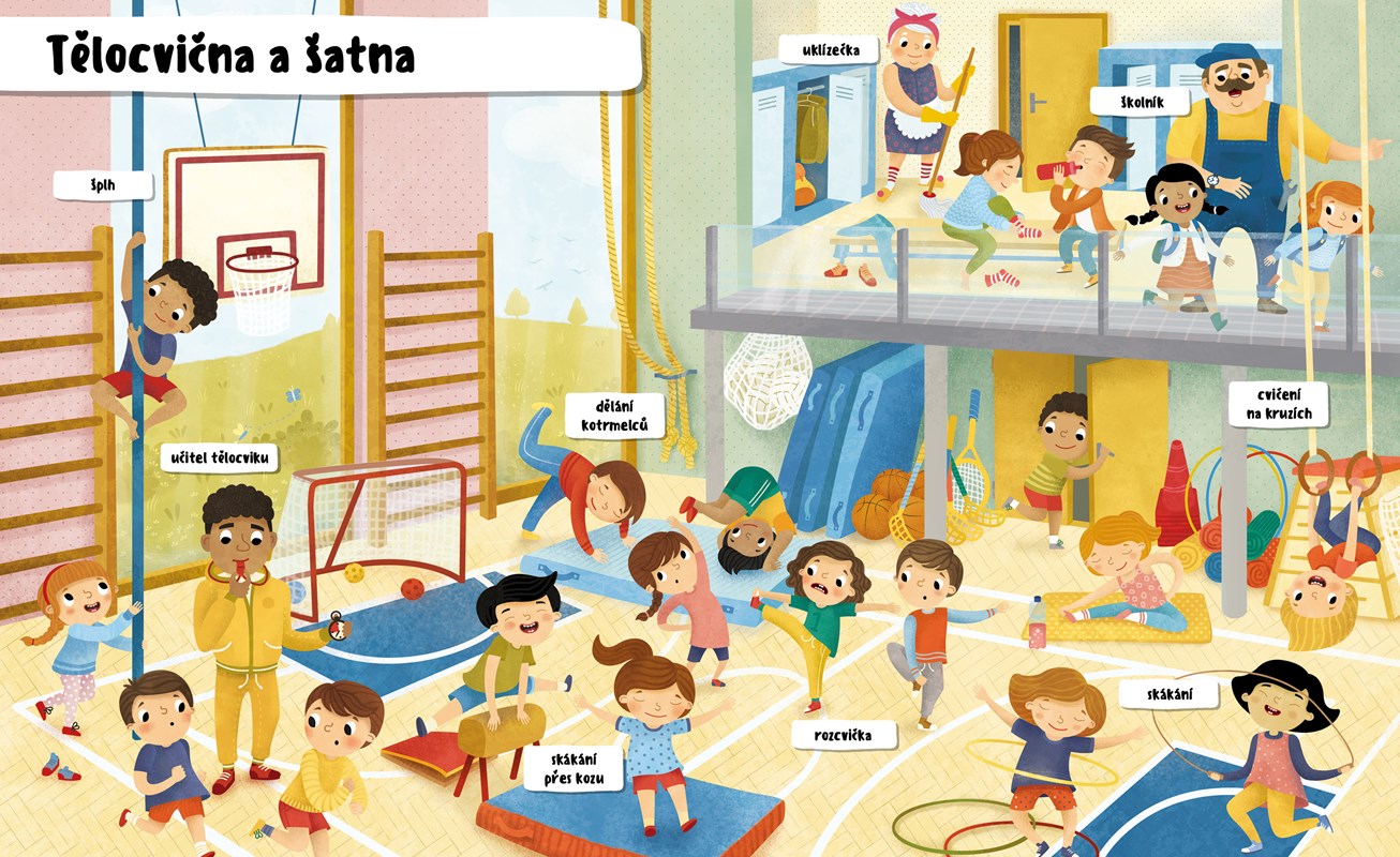 Jak vypadá všední den ve škole? Malí chemici dělají pokusy a jejich nezbední spolužáci se v lavici šermují pravítky. Venku na zahradě děti hrabou listí a paní učitelka jim ukazuje, jak sázet rostlinu do země. V tělocvičně je pěkně rušno – zatímco jedna polovina malých atletů se ještě rozcvičuje, ta druhá už skáče přes kozu. A ve sborovně? Učitelé se tam připravují na další hodinu. Obrázky, které vyprávějí příběhy všedního dne ve škole, podněcují v malém čtenáři představivost a pomáhají mu rozvíjet slovní zásobu. Jen se podívejte, co všechno se děje ve škole!