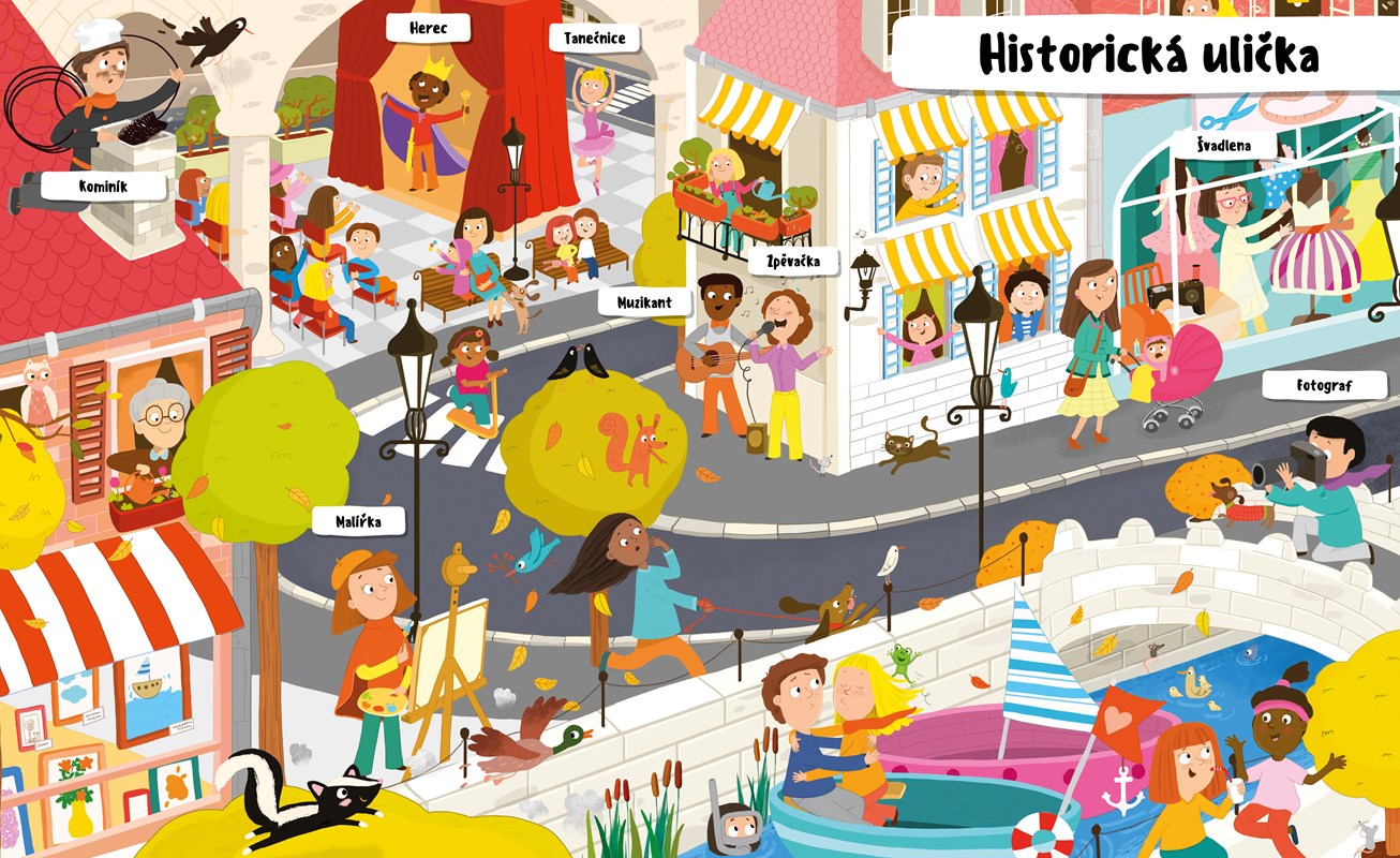 Docela všední obyčejný den ve městě a v cukrárně je zase plno. Aby ne, pracuje zde šikovná slečna cukrářka, jejíž dorty jsou vyhlášené po celém městě. Paní učitelka svolává děti k obědu. Kuchař mezitím připravuje chutnou pečínku… Cukrářka, učitelka, kuchař – už víš, kým chceš jednou být? Poznej tato i mnohá jiná povolání. Zjisti, co ke své práci potřebuje detektiv, baletka, automechanik nebo švadlena. Obrázky podněcují v malém čtenáři představivost a pomáhají mu rozvíjet slovní zásobu.