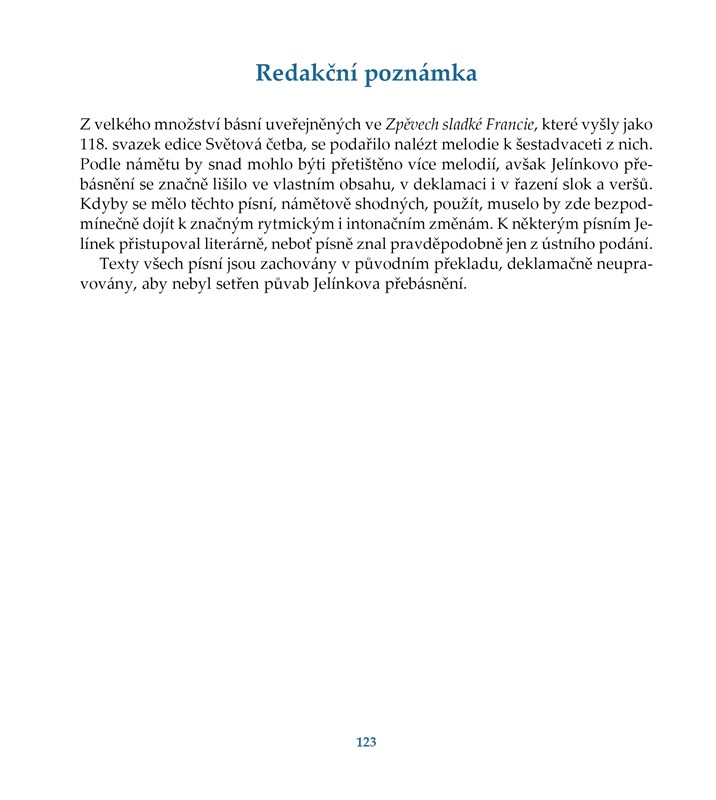 Zpěvy sladké Francie, dnes již klasický výbor francouzských lidových písní, který z vlastních překladů sestavil Hanuš Jelínek, vychází nyní jako zpěvník v hudební úpravě Josefa Krčka a s CD nahrávkou v podání souboru Chairé.