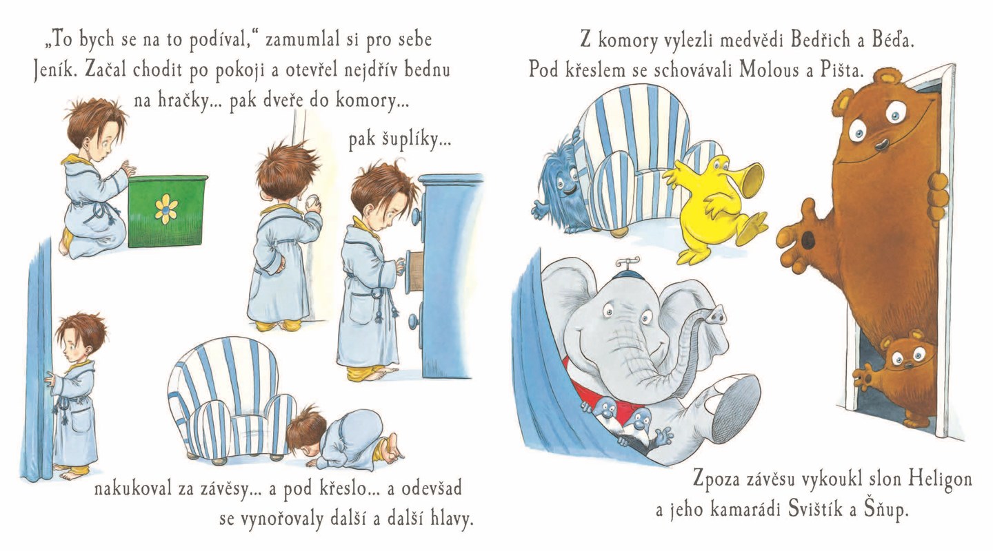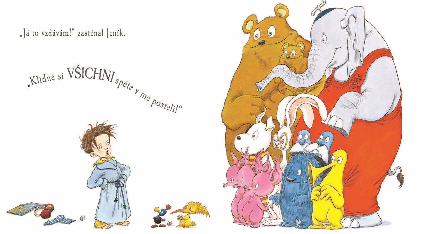 Obrázková kniha Chrise Riddella o chlapci Jeníkovi, kterému jedné noci vyleze zpod postele sympatická příšera – pan Podpostel. Pod postelí je tvrdá zem a panu Podpostelovi se tam špatně spí, proto poprosí Jeníka, jestli by si mohl vlézt k němu. Okamžitě usne, ale chrápe tak, že si Jeník musí jít pro špunty do uší. A co se nestane – ze šuplíku na něj vyskočí další dvě příšerky. Prádelník není pohodlný, takže bez dlouhých okolků skočí pod peřinu k panu Podpostelovi. Další kouzelní tvorové se vynoří postupně ještě z šatní skříně, zpod křesla či zpoza závěsů. „Dobře, vzdávám se!“ rezignuje Jeník. „Všichni dnes můžete spát v mé posteli!“ Příšerky se do ní natlačí a Jeník usne na podlaze, kde ho ráno najde udivená maminka… Vydejte se s knížkou na výlet do světa dětské představivosti!