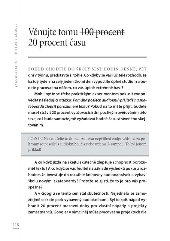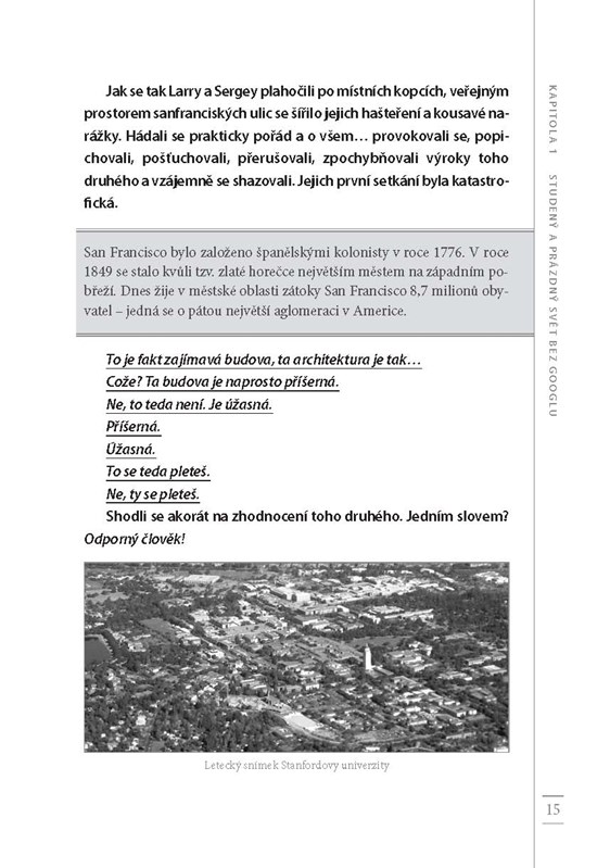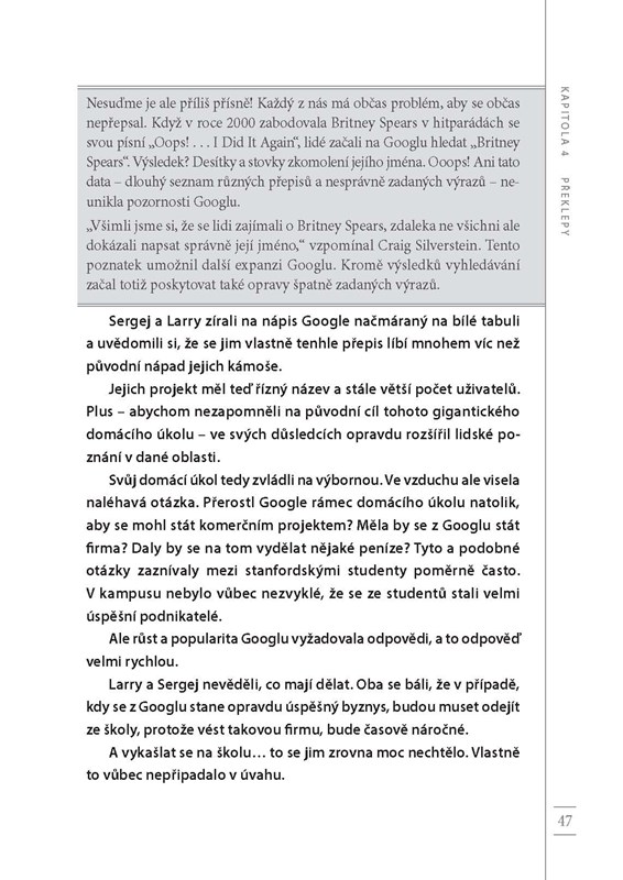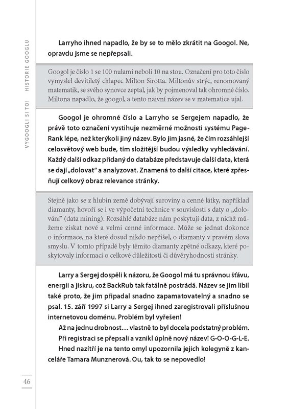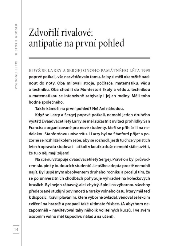 Larry Page a Sergej Brin začali svou kariéru jako dva studenti univerzity Stanford s odvážným nápadem: dát řád všem informacím na světě. Z tohoto zdánlivě snadného cíle brzy vznikla myšlenka na stvoření jedné z nejvlivnějších a nejinovativnějších firem v dějinách. Slovo „google“ se dokonce dostalo do slovníku běžných lidí coby základ pro sloveso značící vyhledávání. V knize Vygoogli si to! najdete pravdivou historii tohoto zázraku – od skromných začátků v podobě diplomové práce kompletované s pomocí vypůjčeného hardwaru a zlevněných hraček, přes revoluci ve vnímání moderních technologií obyčejnými lidmi, až po letmý pohled od budoucnosti na to, kam až by nás technologie mohly zavést příště.