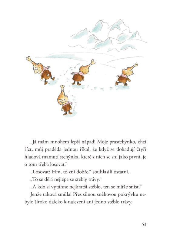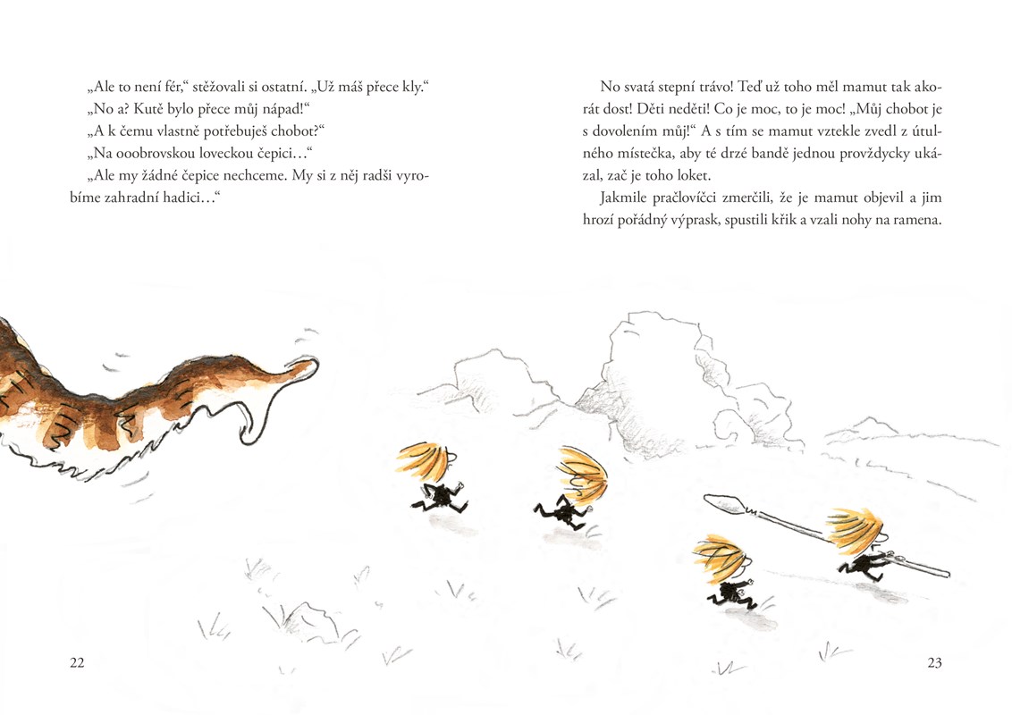 Dost s bobulemi! Malí pračlovíčci už mají všech těch lesních plodů plné zuby a dali by si mamutí steak, pěkně křupavý a šťavnatý! A tak se každý den vydávají na dobrodružný lov. Jenže dobromyslný mamut s velkým zadkem se nehodlá stát pečínkou a dokáže naše malé pračlovíčky pěkně potrápit. Ti se ale nehodlají vzdát, přestože to každý večer doma od rodičů pěkně slíznou a musí za trest spát před jeskyní. Ale pod širým nebem plným hvězd se tak krásně spřádají plány, jak ulovit mamuta!