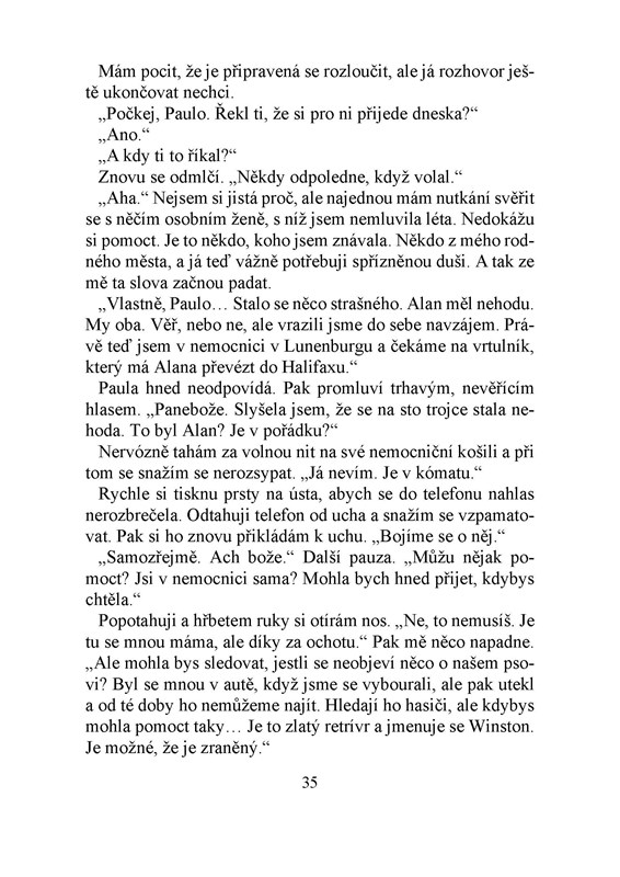 Abbie MacIntyreová má všechno. Milujícího a úspěšného manžela, skvělého syna, krásný dům, oddaného psa a lékařskou kariéru. Jedné osudové noci se její dokonalý život převrátí naruby. Při návratu domů ji ze silnice smete opilý řidič – ten řidič je její manžel Alan... Abbie z nehody vyvázne, Alan však nepřežije. Tragický okamžik přináší spoustu bolestných otázek a ještě bolestnějších odpovědí. Abbie začíná zjišťovat, že její štěstí byla jen iluze. Pravda, kterou se dozvídá, pro ni bude zkouškou. Jak zvládnout osamění? Kde znovu hledat životní sílu? Uprostřed beznaděje se ale začne rodit nečekané citové pouto.