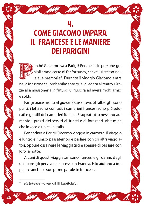 Na stránkách knihy máte možnost nahlédnout do několika epizod z dobrodružného života milovníka žen Giacoma Casanovy. Nemusíte se však obávat, že byste textu neporozuměli. Je napsaný zjednodušenou italštinou tak, aby vyhovoval potřebám začínajícího čtenáře. Na každé stránce naleznete český zrcadlový překlad, cvičení na konci knihy jsou vhodná pro ověřeni získaných znalosti.