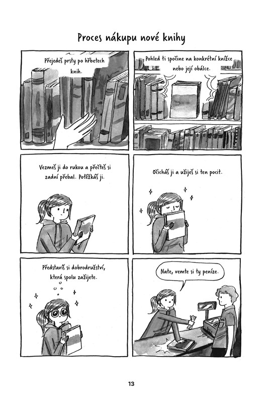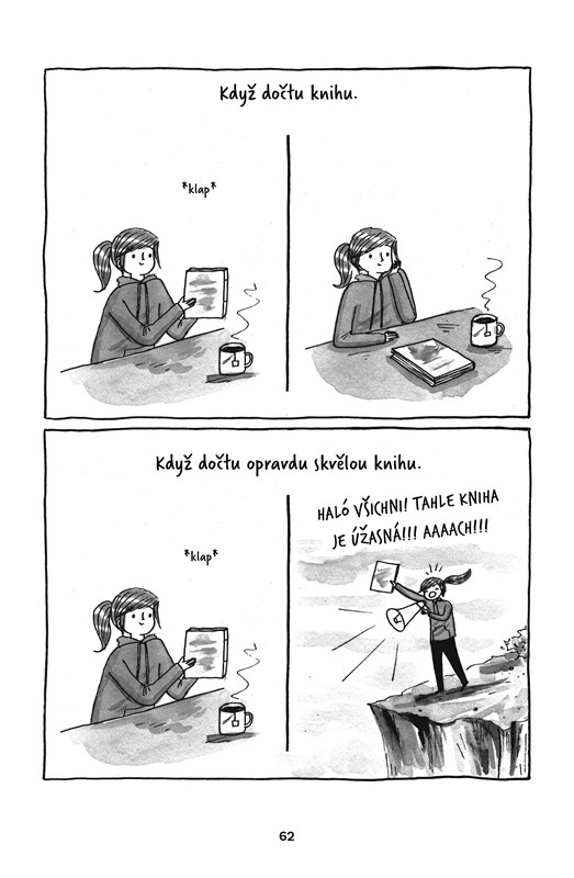 V tramvaji koukáš lidem přes rameno, jen abys zjistila, jakou knížku právě čtou. Než aby sis koupila něco na sebe, raději utratíš celé kapesné v knihkupectví. Tajně (a někdy i naprosto veřejně) čicháš ke svým novým knižním úlovkům. Nejlepší večírek je pro tebe ten, kdy všichni sedí tiše u stolu a čtou si. Zkrátka čteš všude, všechno a pořád, a když zrovna nečteš, o knihách si aspoň povídáš. Poznáváš se? V tom případě je knížka Ze světa knihomolky dalším povinnou položkou na tvém reading listu. U každé stránky tohoto vtipného a milého komiksu se budeš potutelně usmívat a říkat si, že hlavní postava je snad napsaná přímo podle tebe.