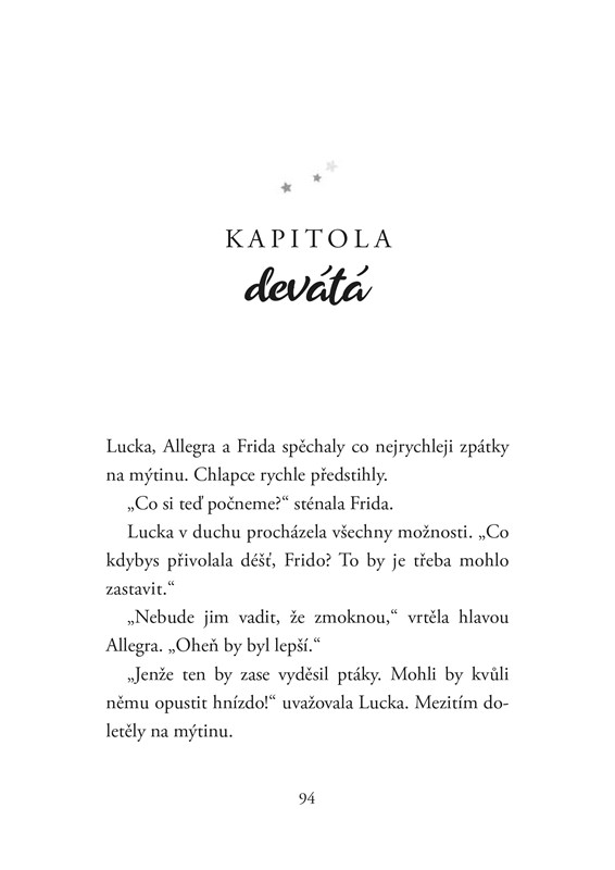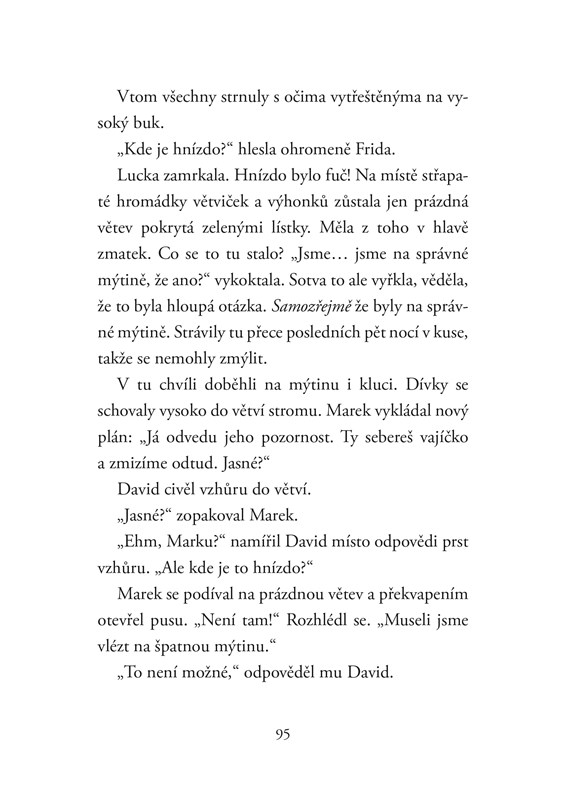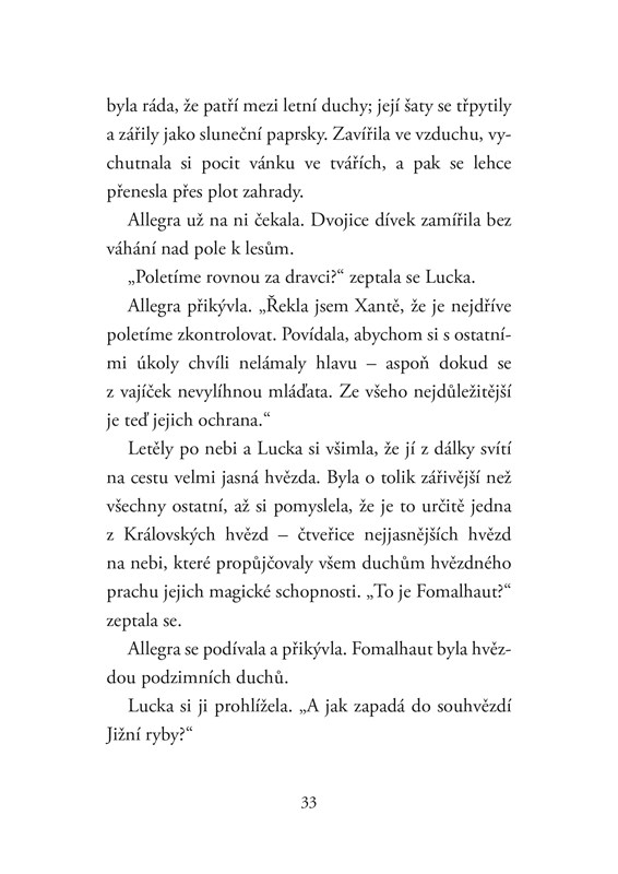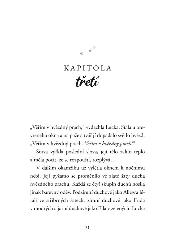 Lucka už nějakou dobu ví, že je duch hvězdného prachu. Duchové umějí létat a chrání přírodu před lidskou neplechou. Nyní nastal čas začít procvičovat svou vyšší magickou moc. Je to velká zábava, ale Lucka a její kamarádky mají starosti. V lese se totiž objevili mladí výrostci, kteří ohrožují párek vzácných dravých ptáku. A navíc mezi čtveřicí nastane první vážný spor. Dokážou ho dívky vyřešit a zachránit vajíčka včelojedů lesních?