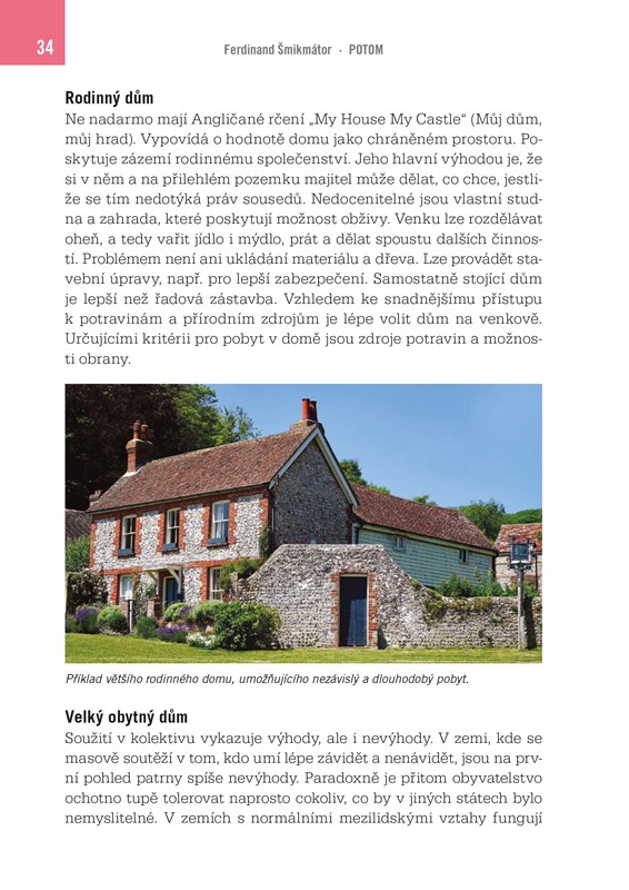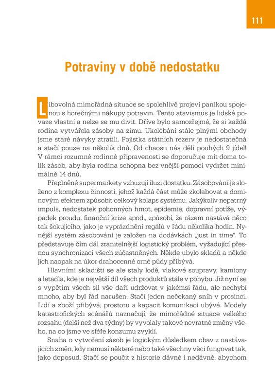 Systém, v němž žijeme, rozhodně není pevný jako skála. Naopak. Stačí několik zdánlivě nepatrných událostí, které mohou uvést do pohybu běh věcí tak, že ze dne na den nastane situace, jež je pro většinu lidí nepředstavitelná. Výčet potenciálních krizových možností je obsáhlý – neznámý virus, blackout, ekonomický kolaps, katastrofální sucho, válka… Každá tato událost může dočasně či natrvalo změnit svět, ve kterém žijeme. A co dál, co budeme dělat POTOM? Jak přežijeme, když v zásuvkách nepůjde elektrický proud, jak nasytíme sebe a své děti v případě rozpadu fungujícího ekonomického systému? Štěstí přeje připraveným, a právě tato kniha poskytuje rozsáhlý soubor informací a rad, jak se na možné budoucí scénáře připravit.