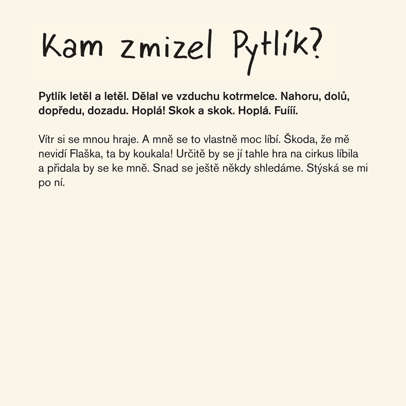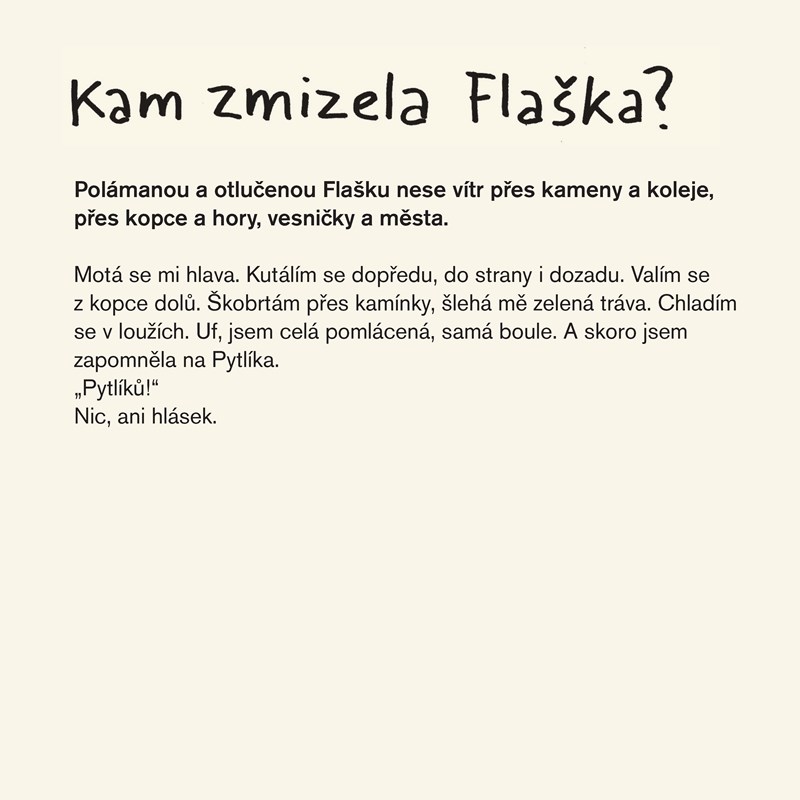 Pytlík a Flaška se potkají na dětské oslavě. Padnou si do oka, ale krutý osud je náhle rozdělí. Následující dobrdružství Pytlíka i dlouhé putování Flašky mohou čtenáři sledovat prostřednictvím výjimečného formátu oboustranné knížky. Jeden uvízne na stromě, druhého spolkne velryba... Myslíte, že se ti dva nakonec zase shledají? A kde to asi bude?