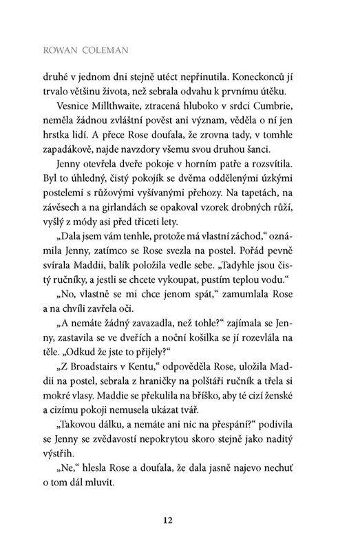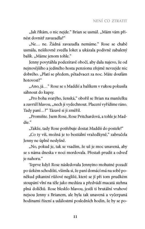 "Rose Pritchardová se odhodlávala dlouho, snad až příliš dlouho. Odejít od násilnického manžela není tak snadné, jak by se mohlo nezasvěceným zdát, a tak Rose dlouhá léta setrvávala v nesnesitelném soužití. Z černé díry beznaděje ji vytáhla docela obyčejná pohlednice: pár laskavých slov od člověka, s nímž se setkala před lety, jen na pár chvil. Tak málo stačilo, aby zdeptaná Rose pochopila, že musí odejít. Že nemá co ztratit. Že může jenom získat.