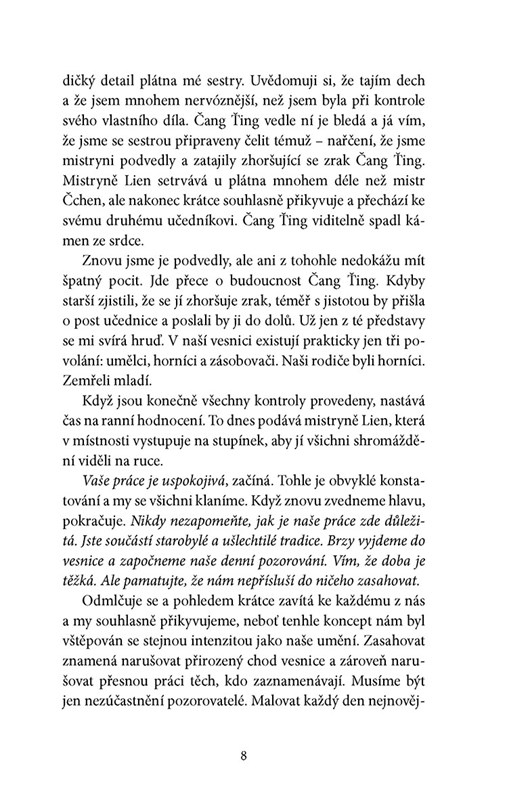 Naprostá závislost není však to jediné, co Fejinu vesnici sužuje: kam až paměť sahá, zdejší lidé neslyší. Jako by takovéto prokletí nestačilo, začínají nyní ztrácet i zrak. Také zásilky jídla přicházející lanovkou se začínají tenčit... Nadcházejí časy zkázy; obyvatelům horské vsi hrozí tichá temnota a smrt hladem.