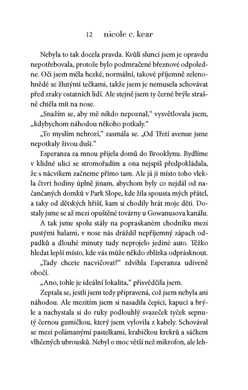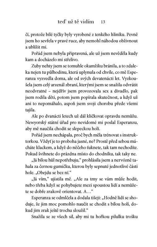 Nicole bylo devatenáct let, když si vyslechla zdrcující diagnózu: má nevyléčitelnou oční chorobu, která ji do deseti let připraví o zrak. Na takovouto zprávu se dá zareagovat v zásadě dvěma způsoby: rozumně, nebo nerozumně. V prvním případě člověk uposlechne lékařových rad a zodpovědně se připravuje na život v temnotě. Nicole ale nemá nic takového v úmyslu.
