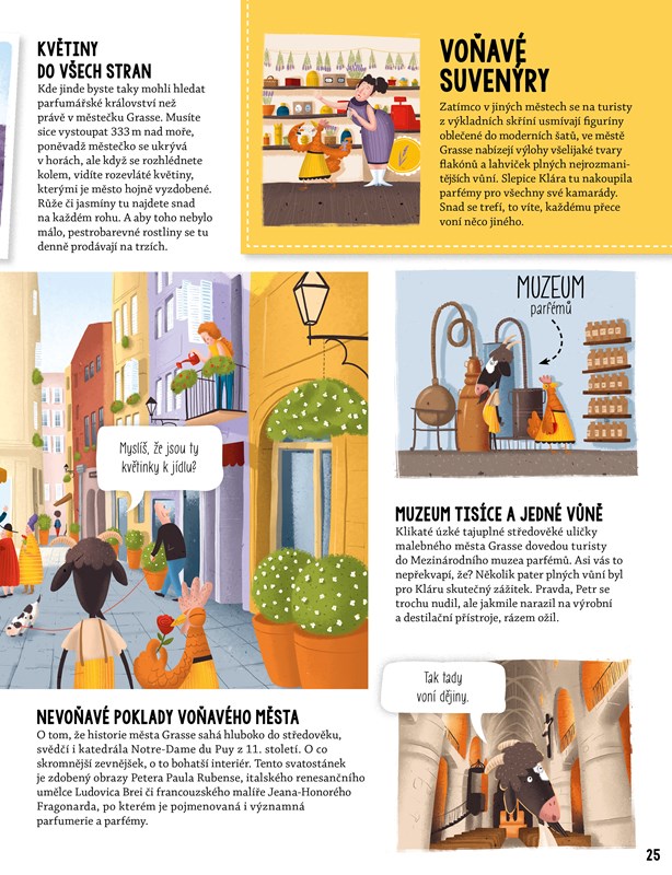 „Ve městech, tam to žije,“ myslíval si kozlík Petr, když na louce přežvykoval zbytky jetele. „Tráva je tam zelenější, sladší a šťavnatější.“ „Jó, takové město, to je jiná,“ kvokala zasněně slepička Klára. „Všude krásné domy, spousta obchodů, ne jako tady na dvoře.“ A protože byli oba nespokojení a chtěli poznat víc, vydali se jednoho dne na cestu za městy. Putovali od severu k jihu, od západu k východu a navštívili města velká, malá, přelidněná, historická i ta úplně moderní. Objevovali jejich krásy a specifika a kolikrát se nestačili divit. Chcete také zažít trochu toho městského dobrodružství? Chvět se zimou v ledovém Jakutsku, zahřát se v pouštním Jazdu či nahlédnout do budoucnosti města dosud neexistujícího? Přidejte se ke zvířecím výletníkům, určitě budou rádi. Stačí jen otevřít stránky bohatě ilustrované knihy a nechat se pohltit ruchem metropolí ze všech koutů světa.