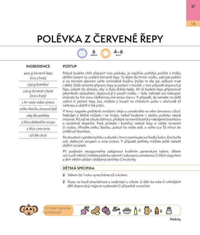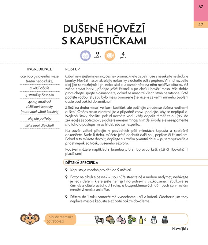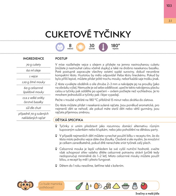 Vařit pro děti může být někdy pořádný oříšek, a to obzvlášť tehdy, chcete-li se zavděčit mlsným jazýčkům malých strávníků, vytříbeným chutím tatínkům a třeba i starším sourozencům, a navíc ještě dbáte na to, aby bylo jídlo výživově hodnotné a zdravé. Každodenní přemýšlení nad tím, co ukuchtit a jak jídelníček poskládat ke spokojenosti vás i vašich ratolestí, si můžete usnadnit, sáhnete-li po receptech z této kuchařky. Najdete tu rozmanité pokrmy – od polévek, přes hlavní jídla, svačinky, pomazánky až k pamlskům, vše přehledně roztříděno podle věku dětí s poznámkami zaměřenými právě na specifika vaření pro nejmenší.