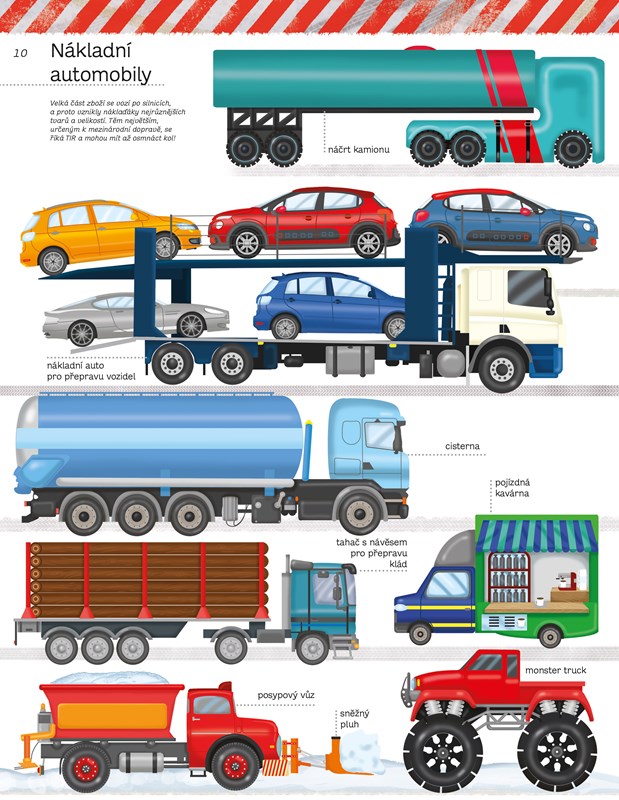 Kniha plná obrázků, v níž najdete všechna vozidla, která znáte, a dokonce i ta, která jste nikdy neviděli. Městská miniauta a terénní vozidla, náklaďáky a tahače, stavební a zemědělské stroje, parní lokomotivy a moderní rychlovlaky, to všechno a mnohem více vás čeká na stránkách této knihy.