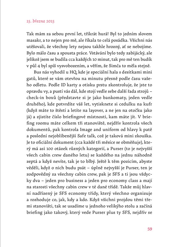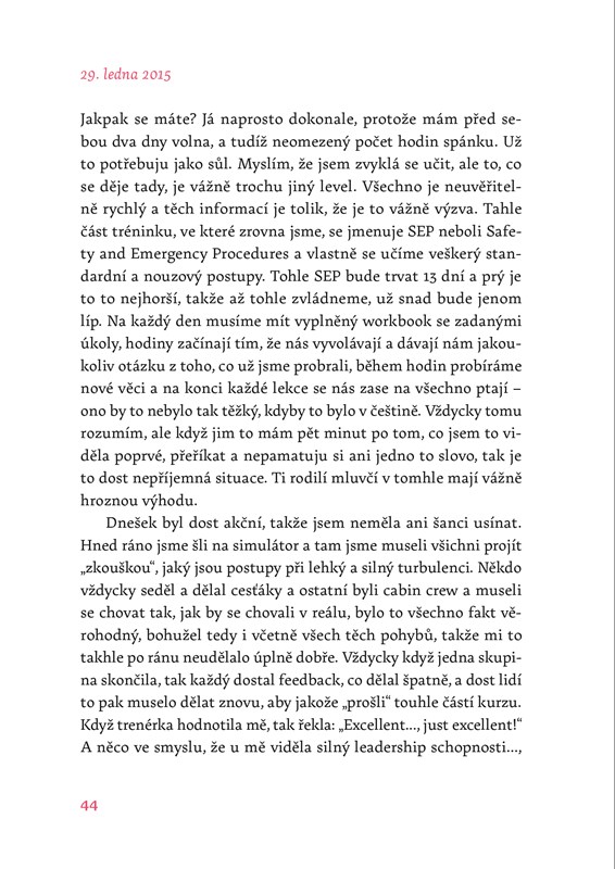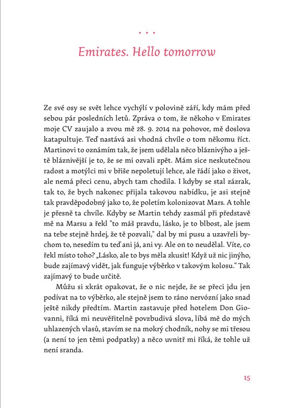 Naposledy přelétne očima z Martina na mě, podá mi JEDNU JEDNOSMĚRNOU letenku a popřeje příjemný let. Moje bagáž už putuje útrobami letiště, ale že bychom bez ní měli lehčí krok, se říct nedá. Spíš naopak, usedáme v Costa Coffee (to ještě netušíme, že to bude jednou naše tradice) a v krku mám takový knedlík, že i kdyby bylo co říct, dost dobře to nejde. Martin je jako vždycky úžasně statečný, snaží se mě rozveselit a tvářit se, že se vůbec nic neděje, skoro mu to i věřím. Poslední obejmutí, políbení, utření slz. Dávej na sebe pozor. Miluju tě. Martinova záda mizící v prosklených dveřích. Pořádný nádech a ještě větší výdech. Jde se na to.