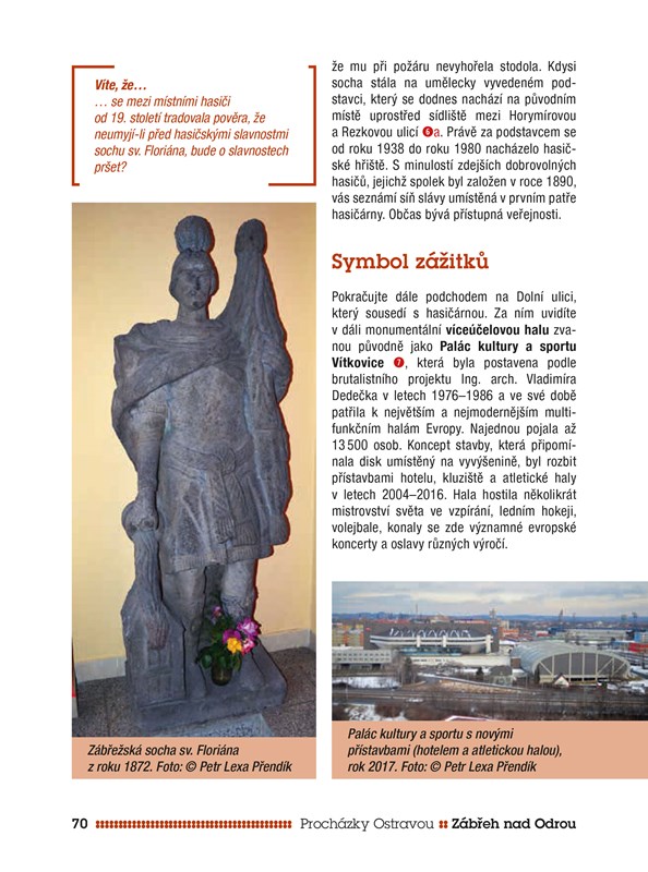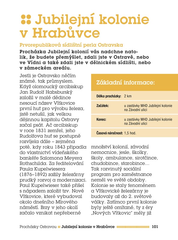 Kniha vám nabízí sedm tematických procházek Ostravou. Snahou bylo vymanit se z klasických turistických okruhů. Spíše než na městská centra se soustředíte na jejich periferie, případně na okrajové části centrálních oblastí. Okruhy vás často zavedou na samou hranici města, ale také do srdce Ostravy, kde naleznete překvapivý klid. Jedna z procházek vás pak seznámí se středem města, ovšem z netypického pohledu kavárenských výloh.