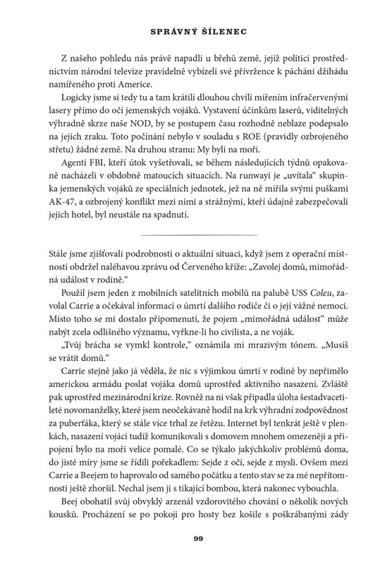 Kniha „Správný šílenec“ se nepodobá žádné autobiografii bývalého vojáka, kterou jste kdy četli. Emerson je totiž zcela upřímný a nesnaží se být korektní. Drží se zásady „padni komu padni“. Upřímný je i v tom, když tvrdí, že pokud jste skvělý voják a někdy i hrdina, automaticky to ještě neznamená, že jste i bezchybný chlap – na druhou stranu to ale znamená, že o tom všem můžete vyprávět skvělý příběh.