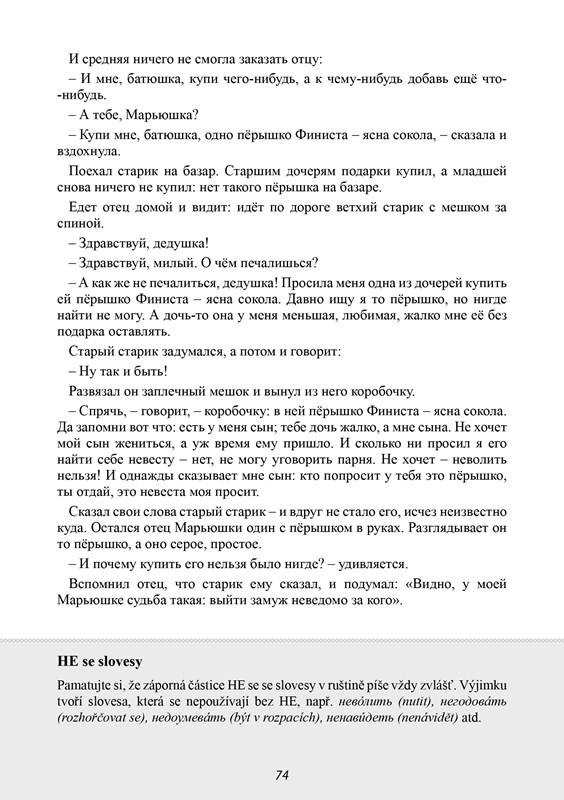 Tři z nejznámějších ruských pohádek – O Mrazíkovi, Finist, jasný sokol a Carevič Ivan a Šedý vlk – jsou zpracovány pro studijní účely a určeny mírně pokročilým studentům ruštiny. Publikace pomůže zábavným způsobem obohatit slovní zásobu, rozvinout schopnost porozumění mluvenému slovu a zdokonalit se ve výslovnosti.