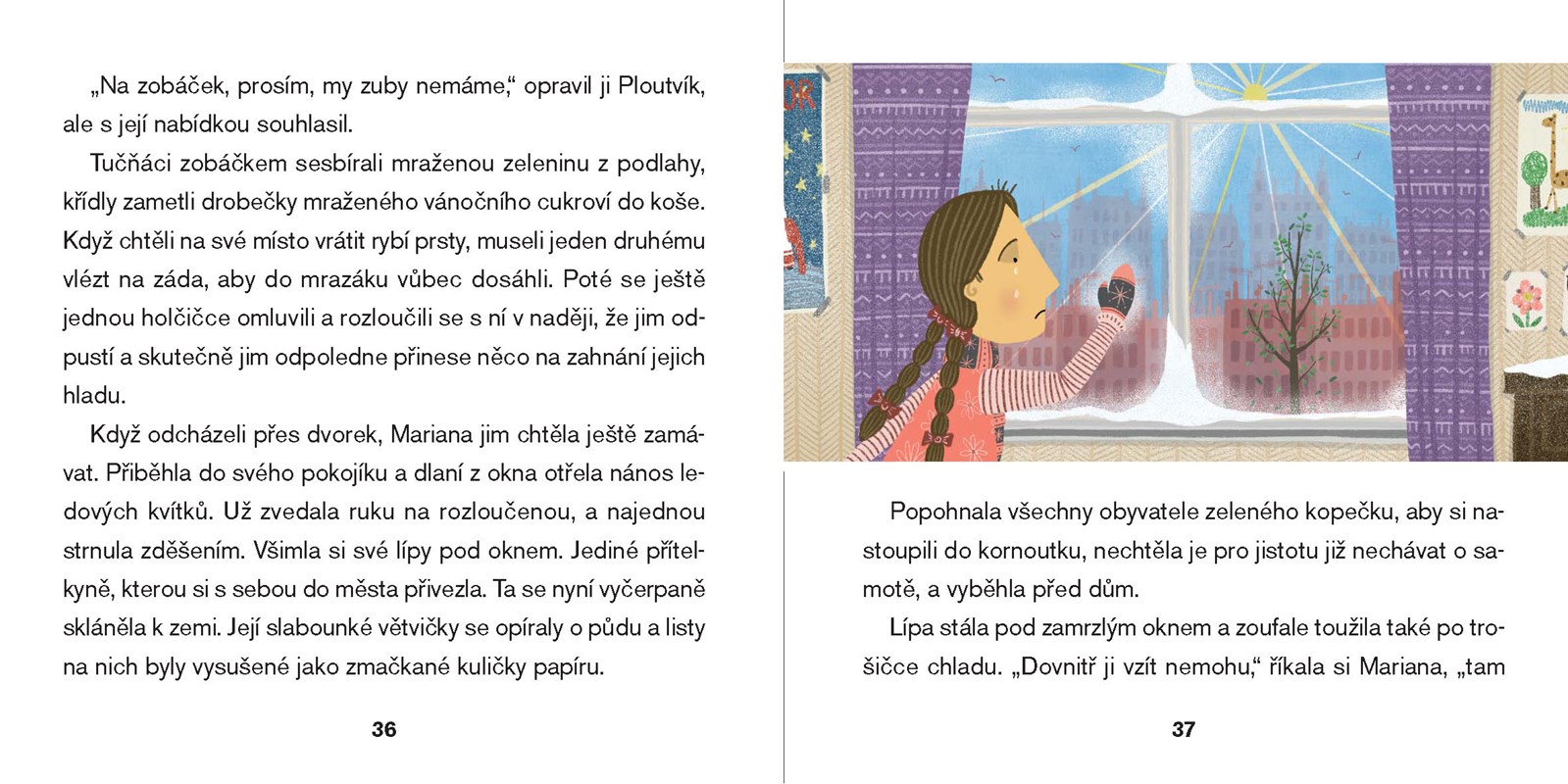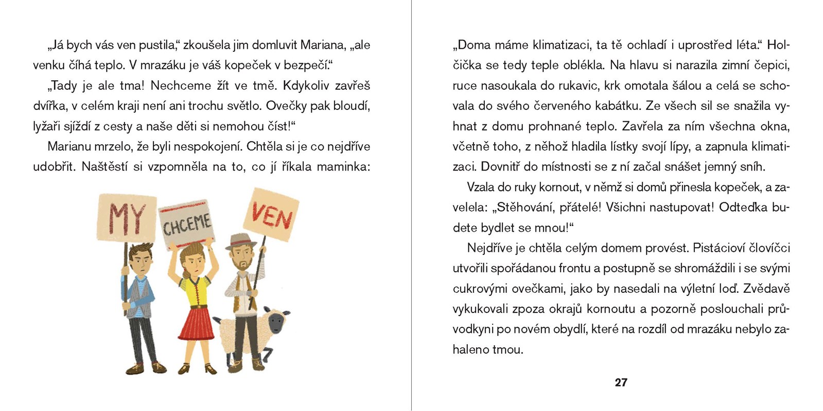 Mariana se s maminkou přestěhovala do velkého města. K jejímu překvapení je tam ale příliš velké horko a málo zelených kopců, ze kterých by se daly válet sudy. Aby maminka svoji dcerku rozveselila, koupí jí alespoň kopeček pistáciové zmrzliny. Horko je ale neúprosné a zmrzlina se začne roztékat. Podaří se Marianě před letní výhní ochránit malé pistáciové človíčky? Pohádka o hledání chladného stínu uprostřed rozpáleného města.