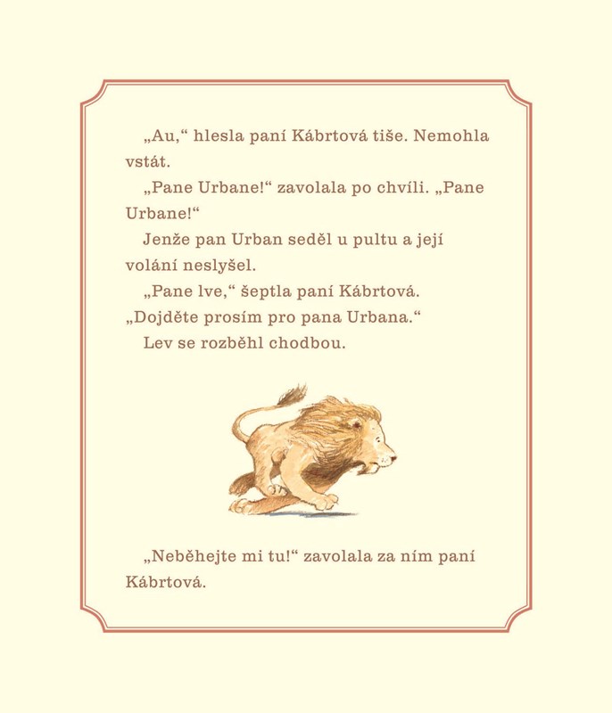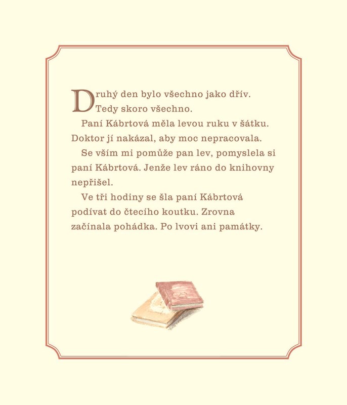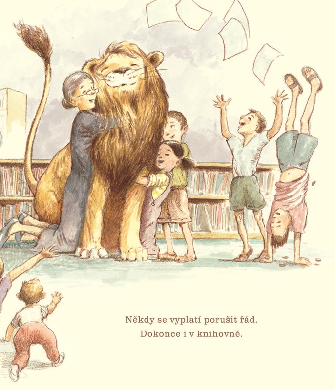 V knihovně paní Kábrtové je každý vítán. Pokud tedy neporušuje výpůjční řád, neběhá a nedělá rámus! Takže když do knihovny jednoho dne přijde lev, není důvod, proč by si s dětmi nemohl poslechnout pohádku. Zanedlouho si čtenáři už ani nedokážou představit, že by toho sympatického lva v knihovně neměli. Pomáhá olizovat obálky s upomínkami, vysazuje děti pro knížky do vyšších polic a kdykoli se předčítá pohádka, nesmí mezi posluchači chybět. Jenže pak se najednou všechno zvrtne a lev poruší výpůjční řád...