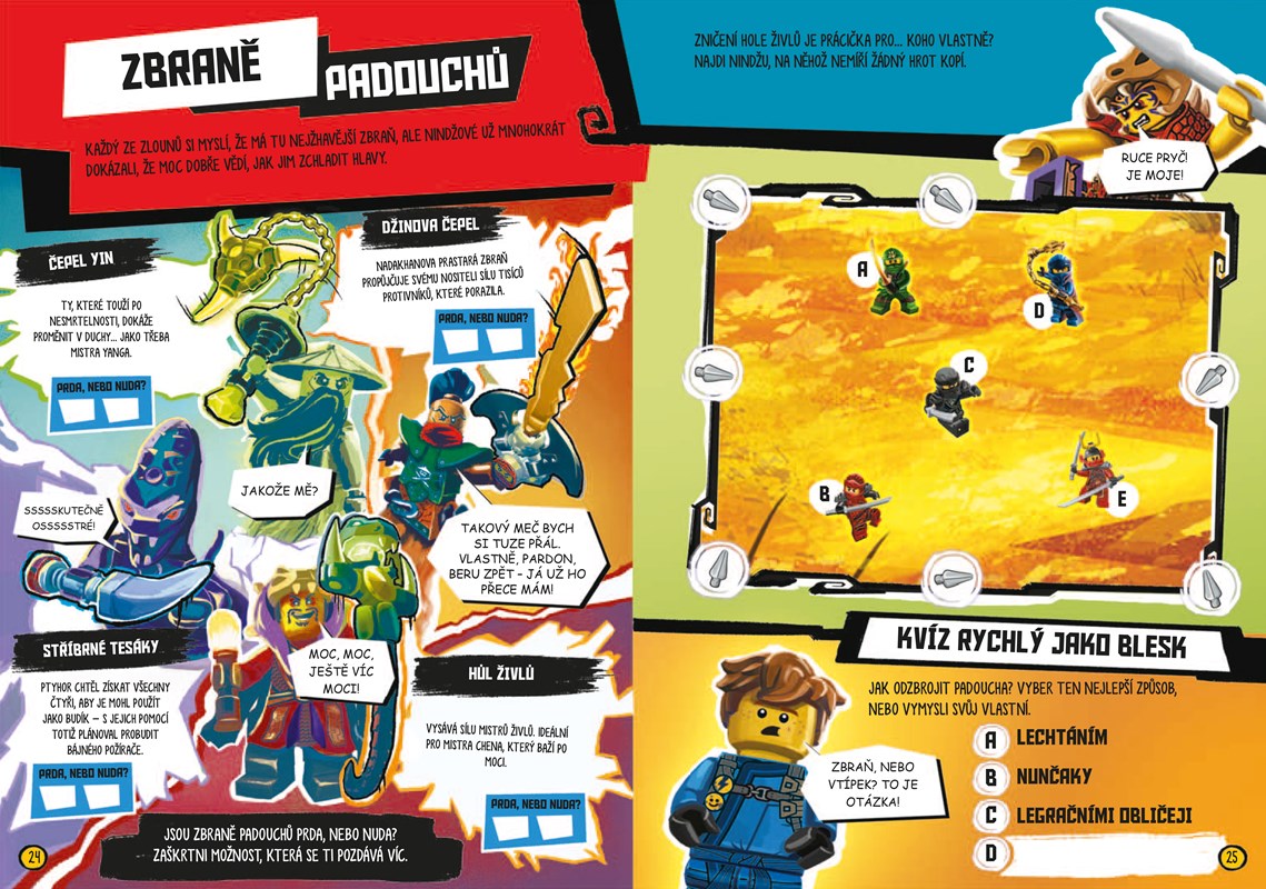 Vyzbroj se do úžasné nindžovské akce, kterou zažiješ díky této báječné knize plné aktivit! Využij svých znalostí o slavných zbraních, které se objevily ve světě Ninjago, a pomoz nindžům porazit jejich nepřátele. Ohodnoť své oblíbené čepele a vymysli si vlastní živelnou výzbroj, s jejíž pomocí vyřešíš hádanky, užiješ si nejrůznější aktivity a zabavíš se legračním komiksem.
