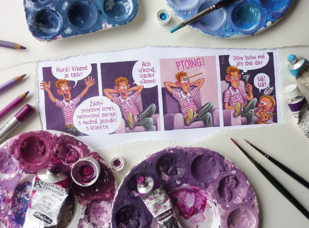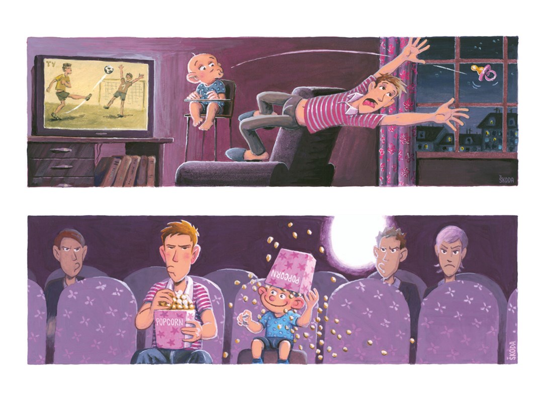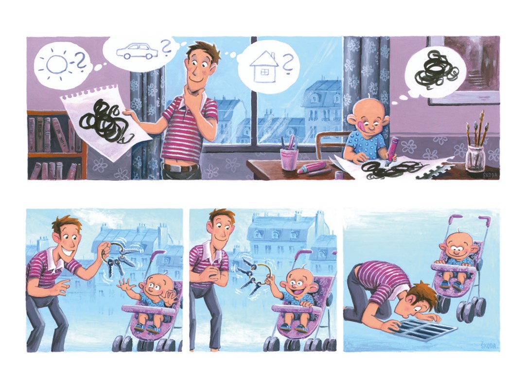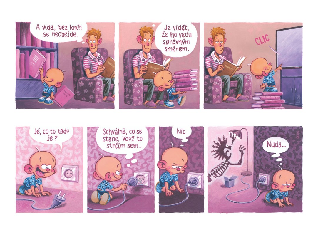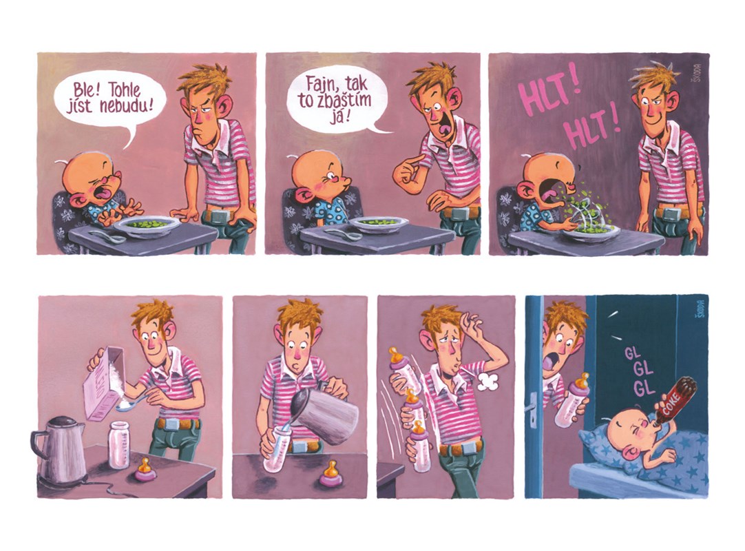 Psssst! Ať ho nevzbudíte! Táta chrápe u telky a já uklízím po obědě. Překvápko, chápete? Hele, ve třech letech jsem už velkej kluk, takže nou problém. Vezmu věci ze stolu, napustím dřez, naleju jar… jů, citrónovej, jak asi chutná? .. tfuj!… vezmu houbičku a pod vodou všechno pečlivě umeju. Lžičku, hrneček, mojí lahvičku, tátův mobil… ten dělá senza bublinky a pod vodou jako tak legračně bzučí, hi hi. Pro sichr ho nechám ještě chvilku odmočit. Bude jako novej! A hele, táta se probouzí, kouká na mě a dělá legrační obličeje, cha cha.