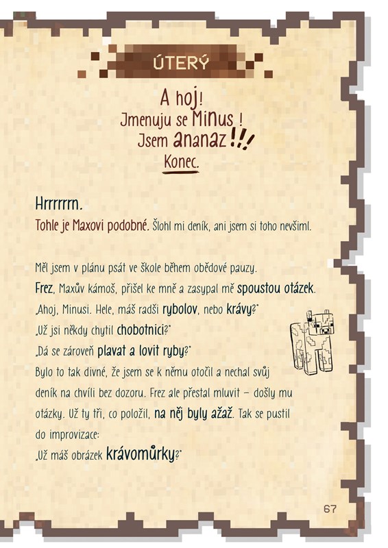 Všechny svoje zážitky Minus barvitě líčí ve svých denících. Od prvních dnů ve škole přes nové spojence až po velký střet s nepřátelskými moby. Připravte se na divokou jízdu plnou akce, překvapení, nečekaných zvratů a samozřejmě Minecraftu.