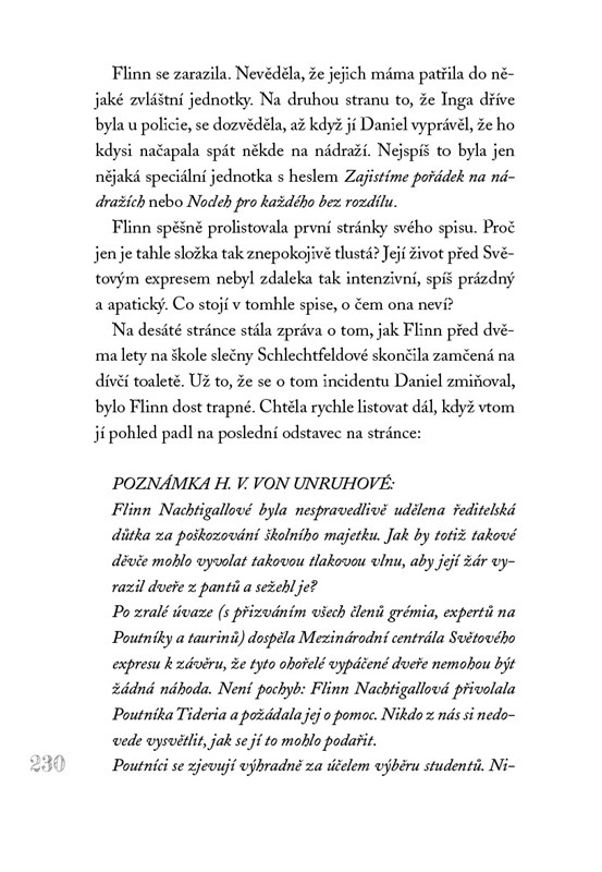 Flinn se konečně stala plnohodnotnou studentkou ve Světovém expresu – magické internátní škole na kolejích. Teprve se vyrovnává s očekáváním okolí, jež jí předpovídá velké činy, když ve vlaku začnou řádit tajemné stíny a ve škole přestane být bezpečno. Studenti i učitelé jsou v ohrožení a zdá se, že právě Flinn je tou, kdo může najít správné odpovědi a všechny zachránit. Ani nečekané setkání s nevlastním bratrem Jontem nevnese do záhady nové světlo. Ba naopak!