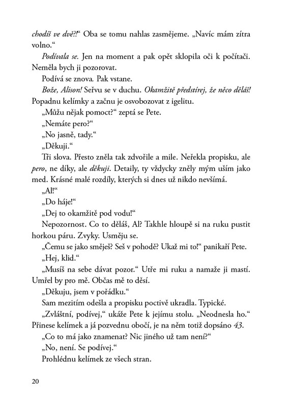 Alison už toho za svůj život viděla a zažila tolik, že si je jistá tím, že ji jen tak něco nepřekvapí. Pak ale do její kavárny začne chodit Sam. Tichá dívka, která s pravidelnou přesností ve dvě přijde, objedná si čaj s sebou, ale posadí se s ním ke stolečku. Úderem čtvrté se zvedne a odejde. A tak je to každý den. Má její chování nějaký smysl?