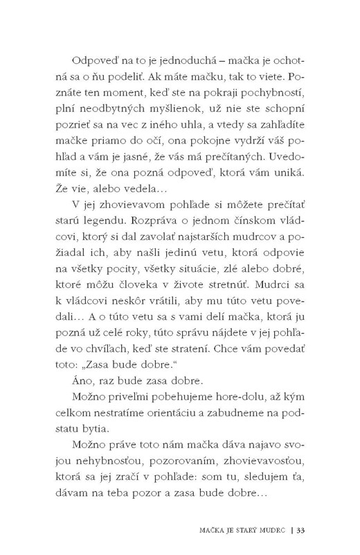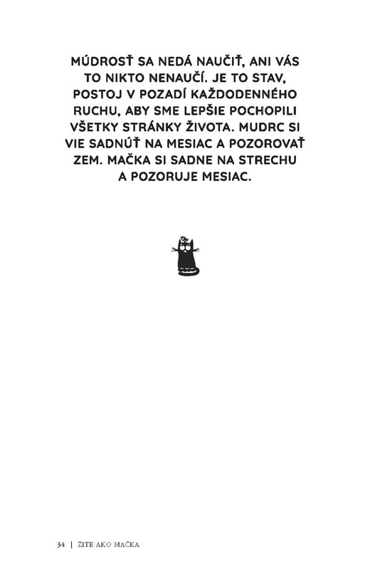 Naši štvornohí priatelia už dávno pochopili, o čom je život. Toto poznanie viedlo Stéphana Garniera k napísaniu jedinečnej príručky osobného rozvoja, ktorú držíte v rukách. Mačka je slobodná, pokojná, všímavá, opatrná, elegantná, charizmatická, nezávislá, hrdá, samostatná. Tieto obdivuhodné vlastnosti môžete v sebe ľahko a každý deň rozvíjať aj vy, ak sa budete inšpirovať jej životným štýlom.