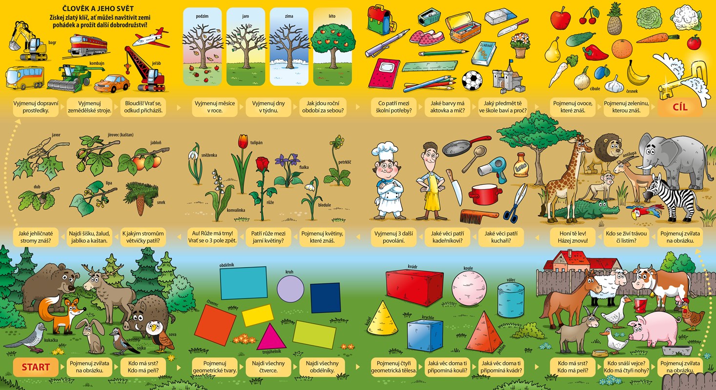 První plánek knihy je zaměřen na procvičení prvouky. Následující tři plánky se pak věnují počítání, a to nejprve do pěti, následně na dalším plánku do deseti a nakonec i do dvaceti. Děti, které se již seznámily s písmenky, mohou namísto rodičů číst krátké texty, skrze něž k hráči promlouvají pohádkové postavičky z herních plánků.