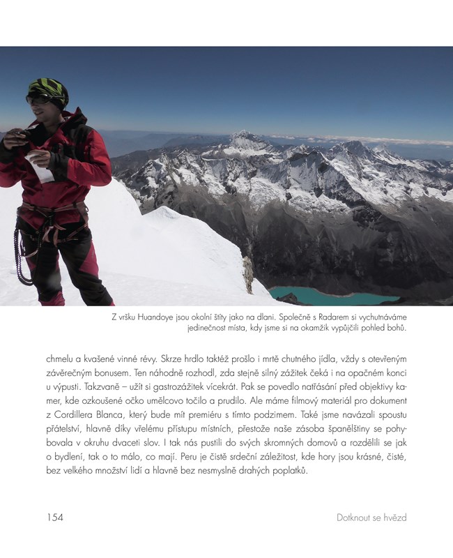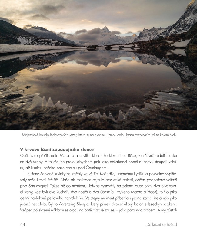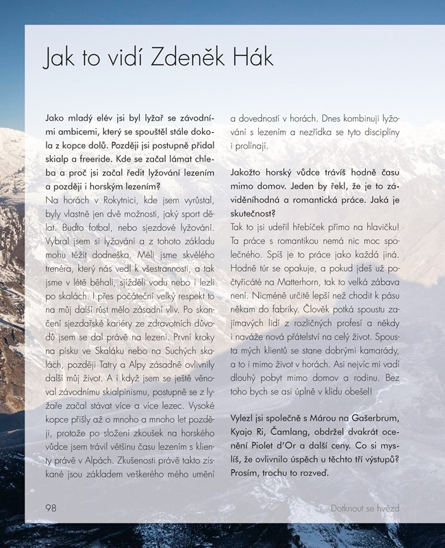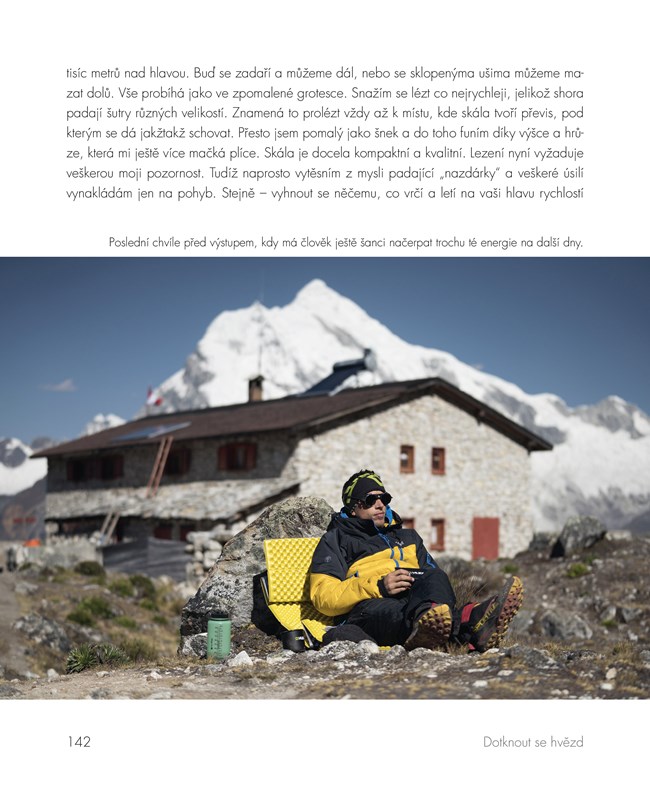 Každým nádechem v řídkém ledovém vzduchu jsem byl blíž k naplnění snu. Též smrti, která čekala jen na drobné zaváhání. Vnímal jsem vlastní křehkost, naprosté vyčerpání a zároveň silnou radost z bytí. Rok 2019 mým horským výpravám doopravdy přál. Nové výstupy mi přinesly uznání i ocenění za nejlepší horolezecký počin na světě. Lezení však není o stupních vítězů, ale o zážitku, kdy se dotýkáte překrásných štítů pod oblohou plnou hvězd.
